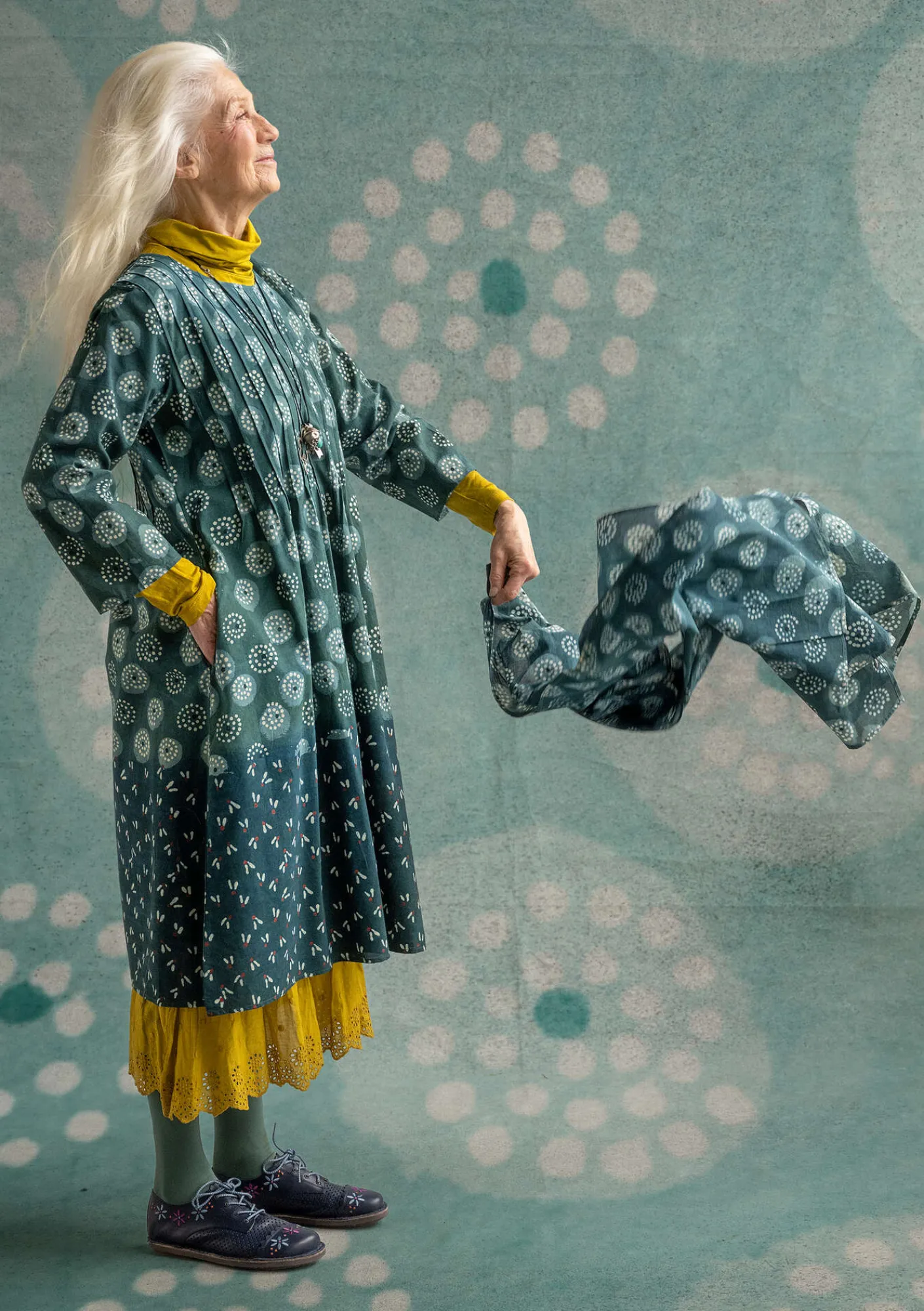 Gemusterter Schal, mithilfe von Lehm-Reservage blockbedruckt und in mehrere Farbbäder mit Pflanzenpigmenten getaucht.