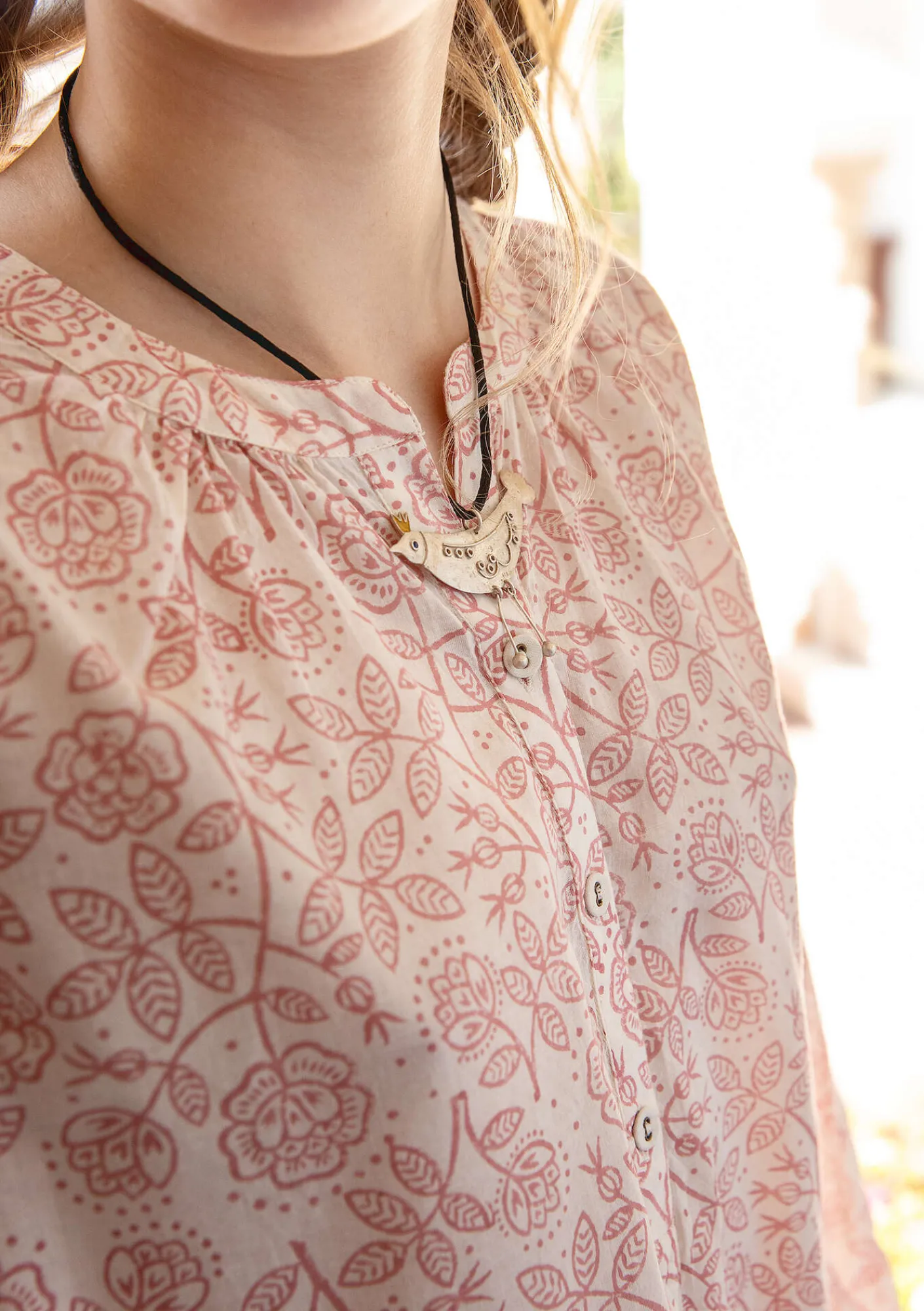Blockdruck-Bluse mit hübschen Vogesen-Rosen. Modell mit abgerundetem Saum und Knopfleiste mit Kellerfalte, für eine schöne Weite. Stehkragen, Stoffknöpfe und Passe auf dem Rückenteil. Pludrige lange Ärmel mit Paspel an der Schulternaht.