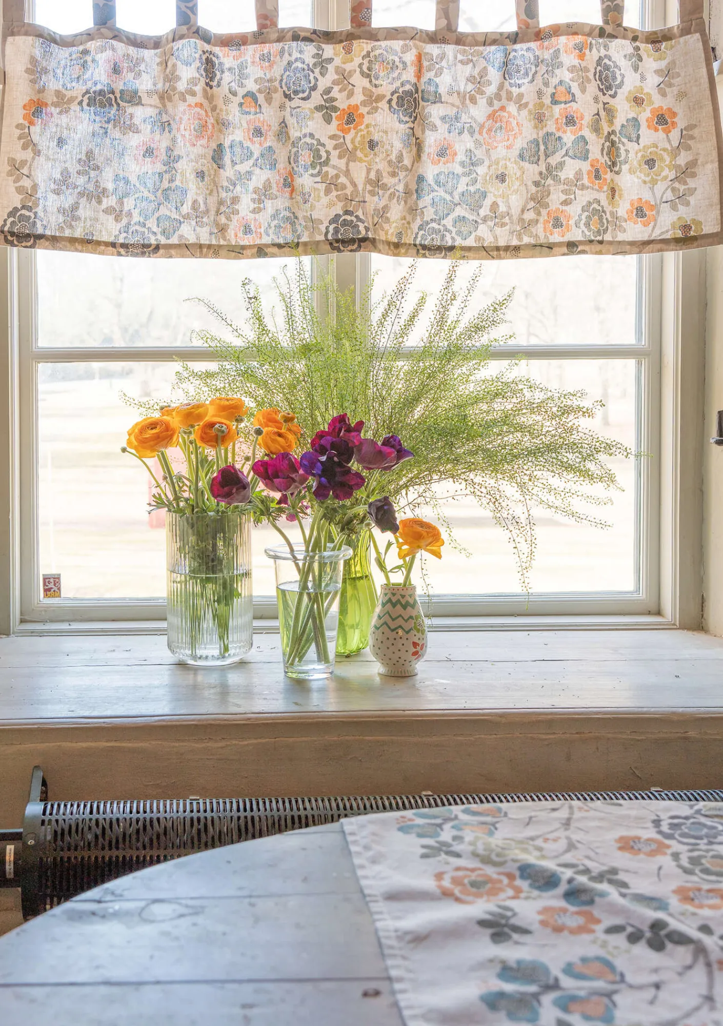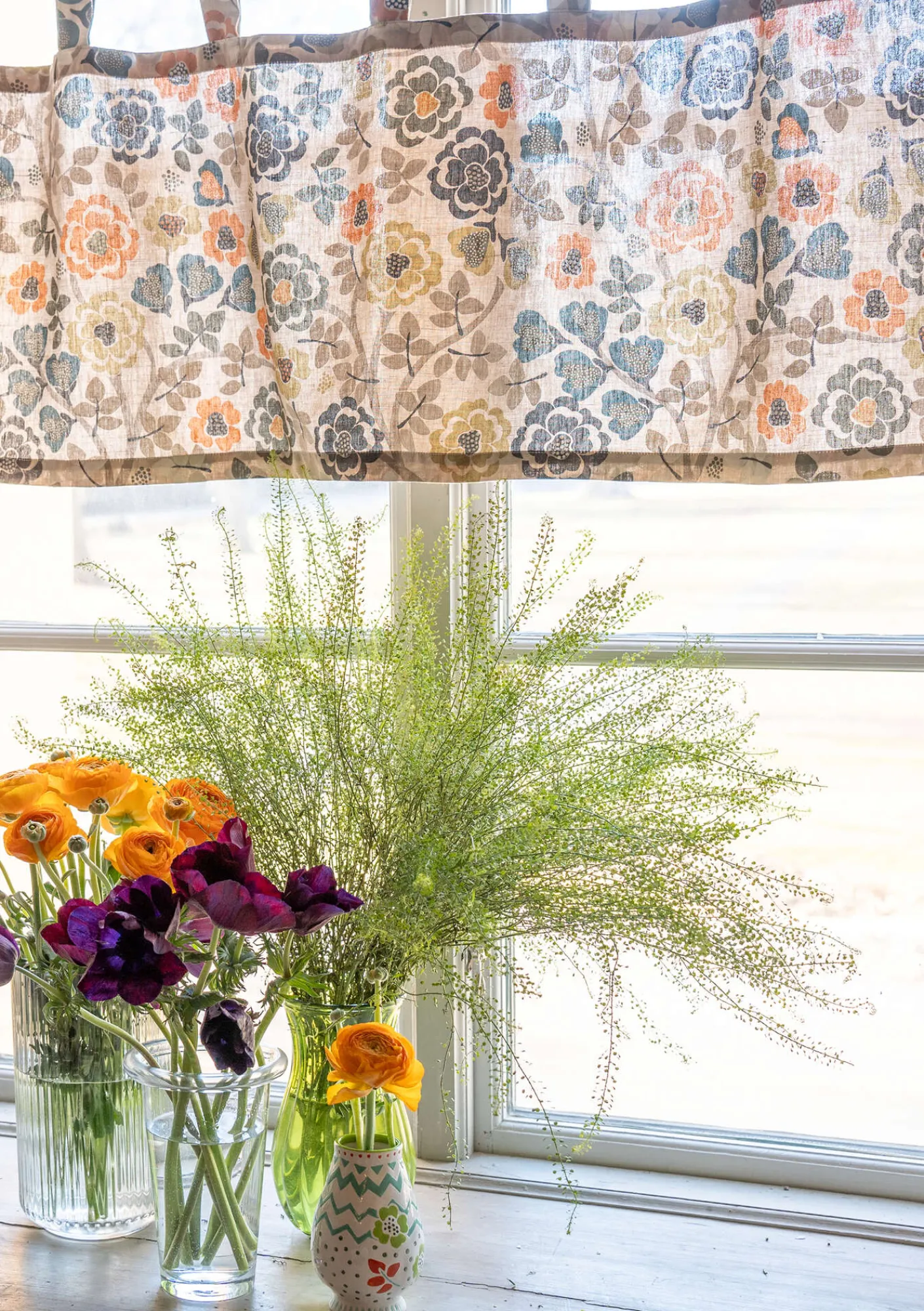 Kaffeehausgardine mit floralem Muster. Modell mit Schlaufen zum einfachen Aufhängen. Bedrucktes Gewebe aus Leinen und Bio-Baumwolle.