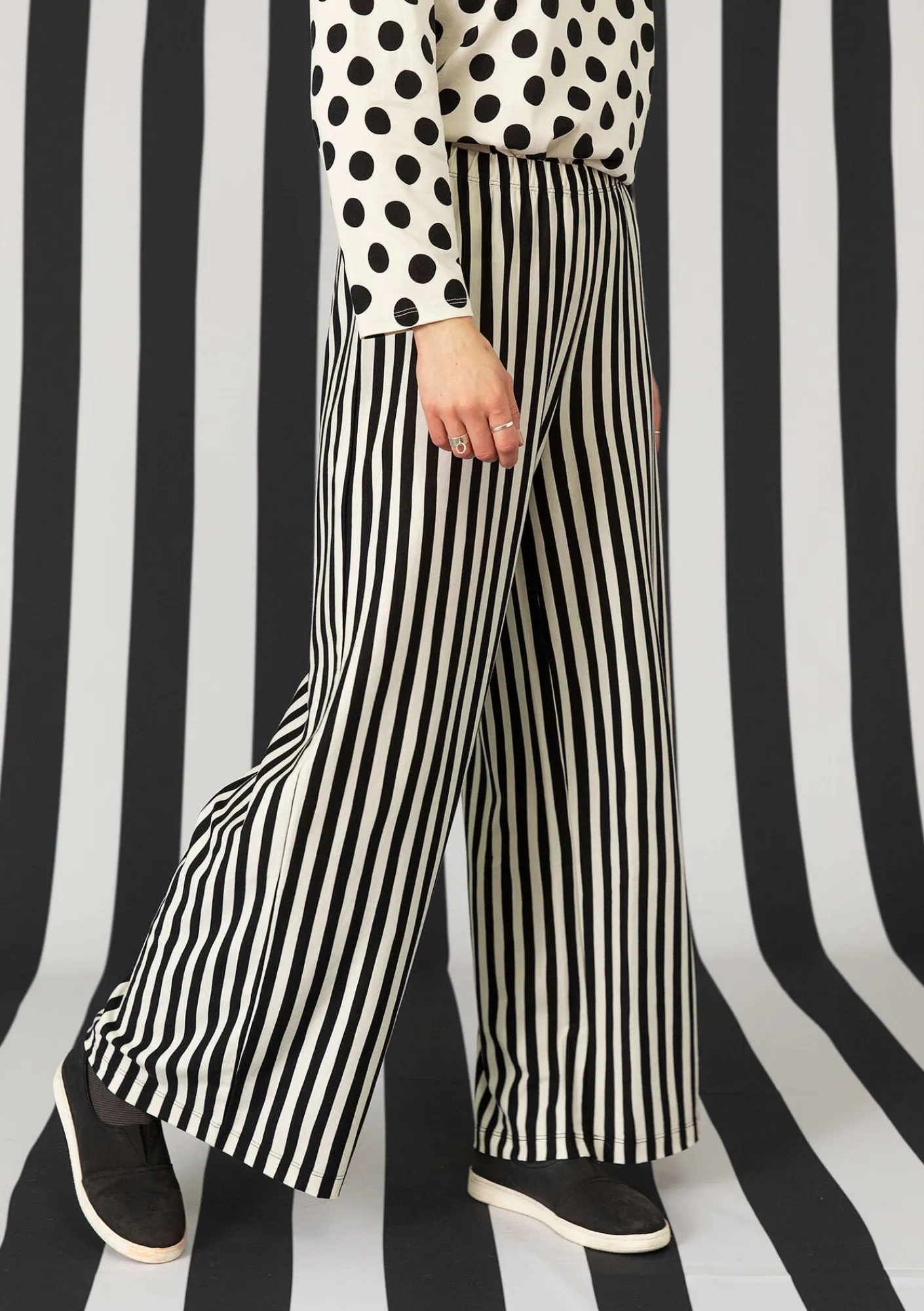 Lange Jerseyhose mit schöner Beinweite und bequemem Dehnbund. Längsstreifen dank geänderter Stoffrichtung.