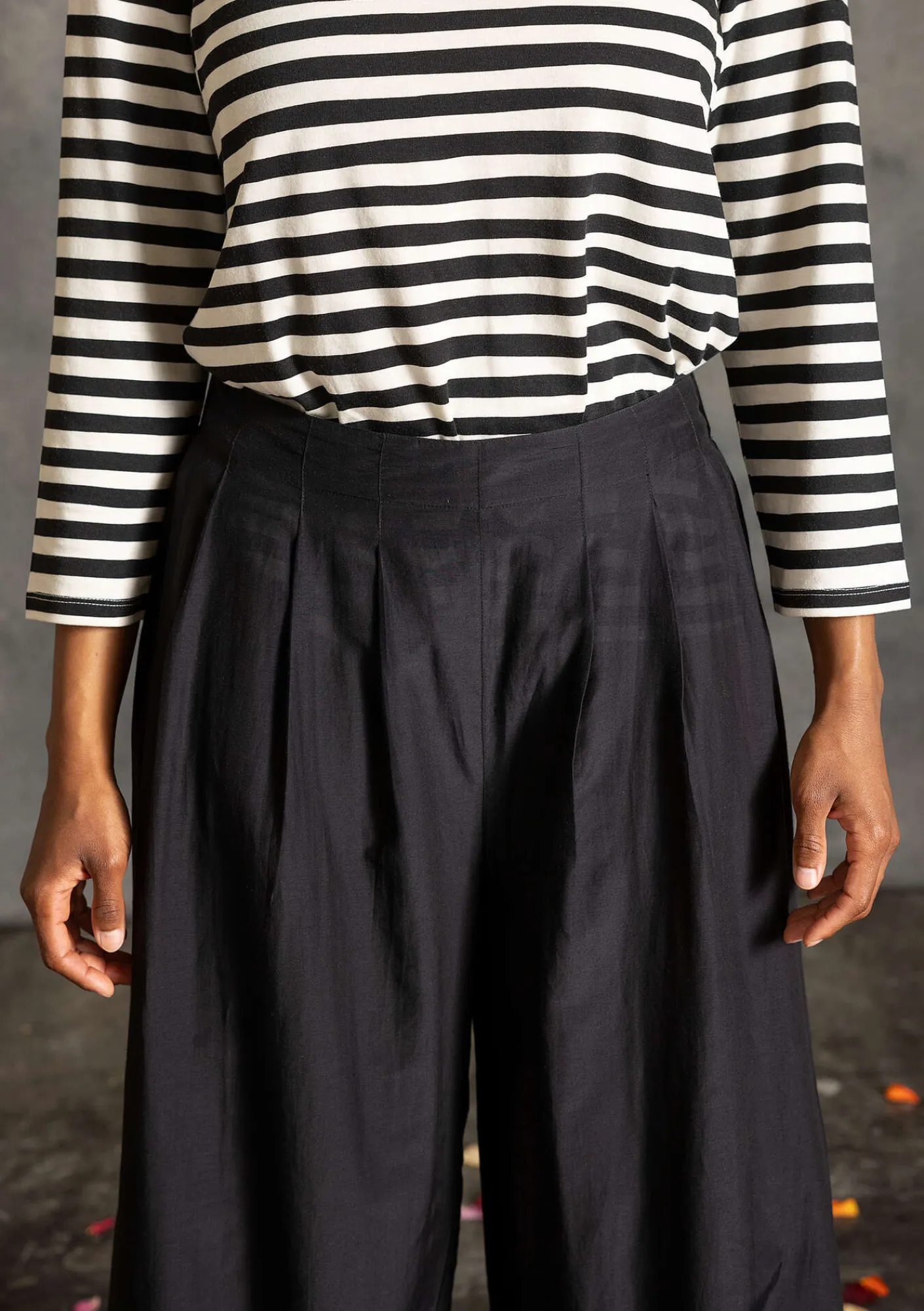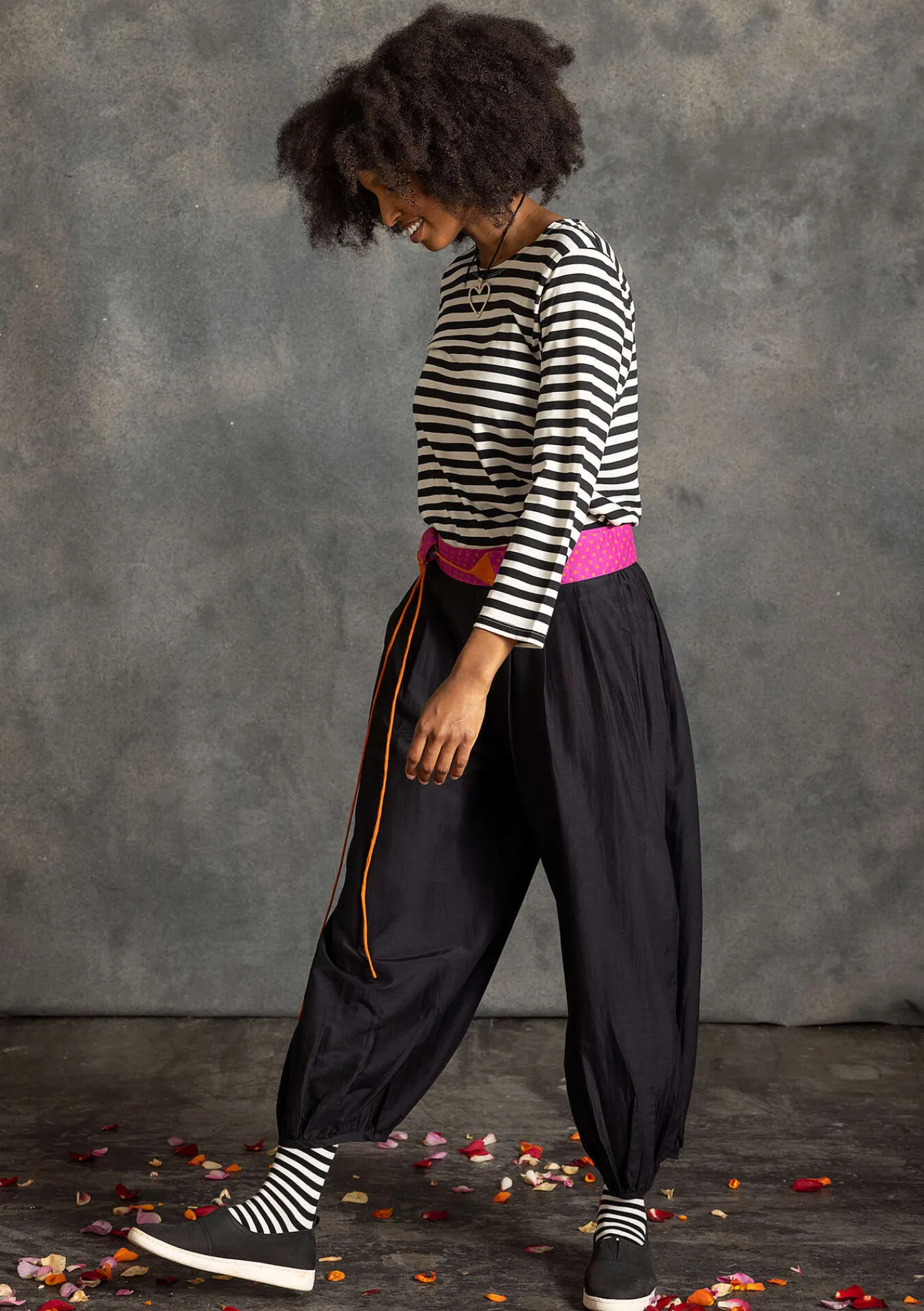 Pluderhose aus einer wunderbaren Qualität mit schönem Fall. Bund mit abgesteppten Falten und bequemem Gummizug hinten. Gekräuselte Beinabschlüsse.