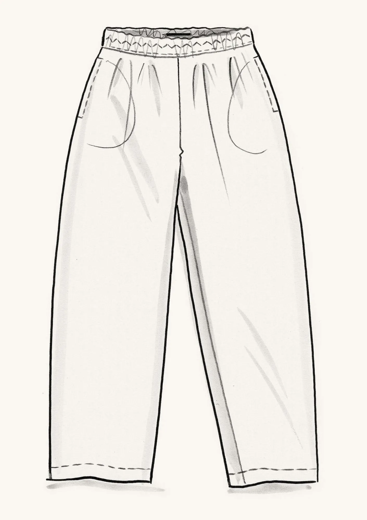 Knöchellange Hose mit innen liegendem Gummizug im Bund und Seitentaschen.