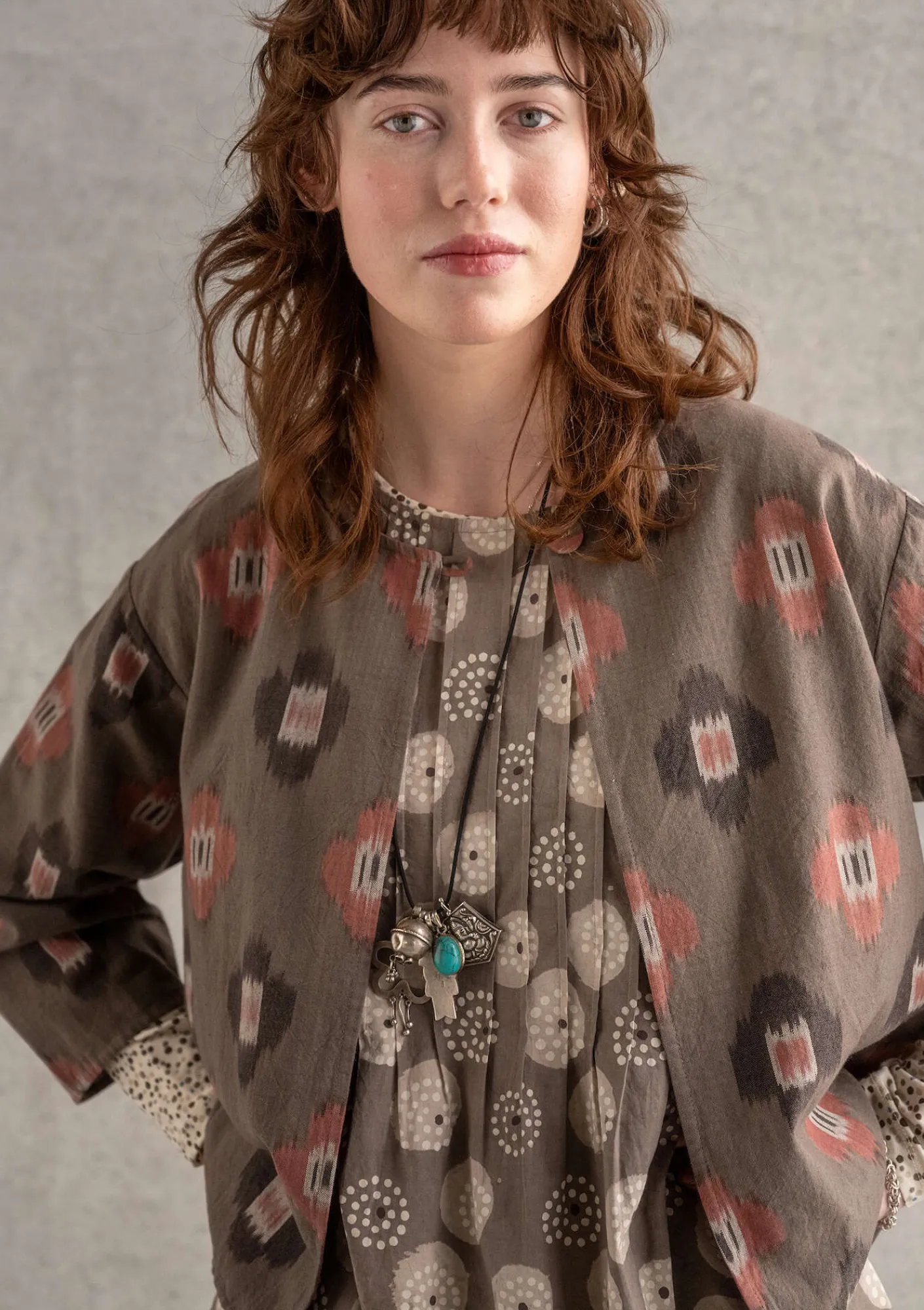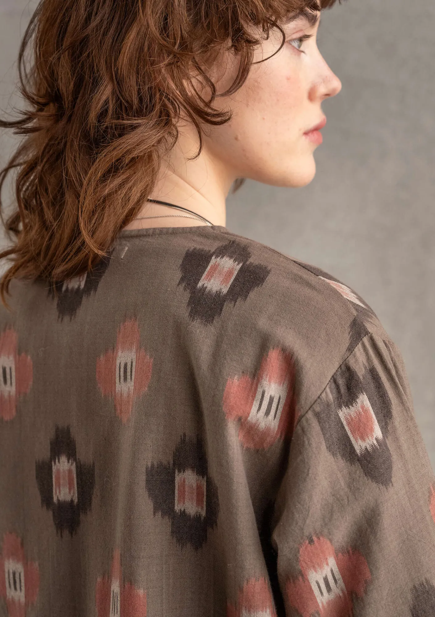 Jacke mit floralem Ikat-Webmuster. Leicht ausgestelltes Modell mit rundem Ausschnitt und 3/4-Ärmeln. Mit einem Stoffknopf zu schließen.