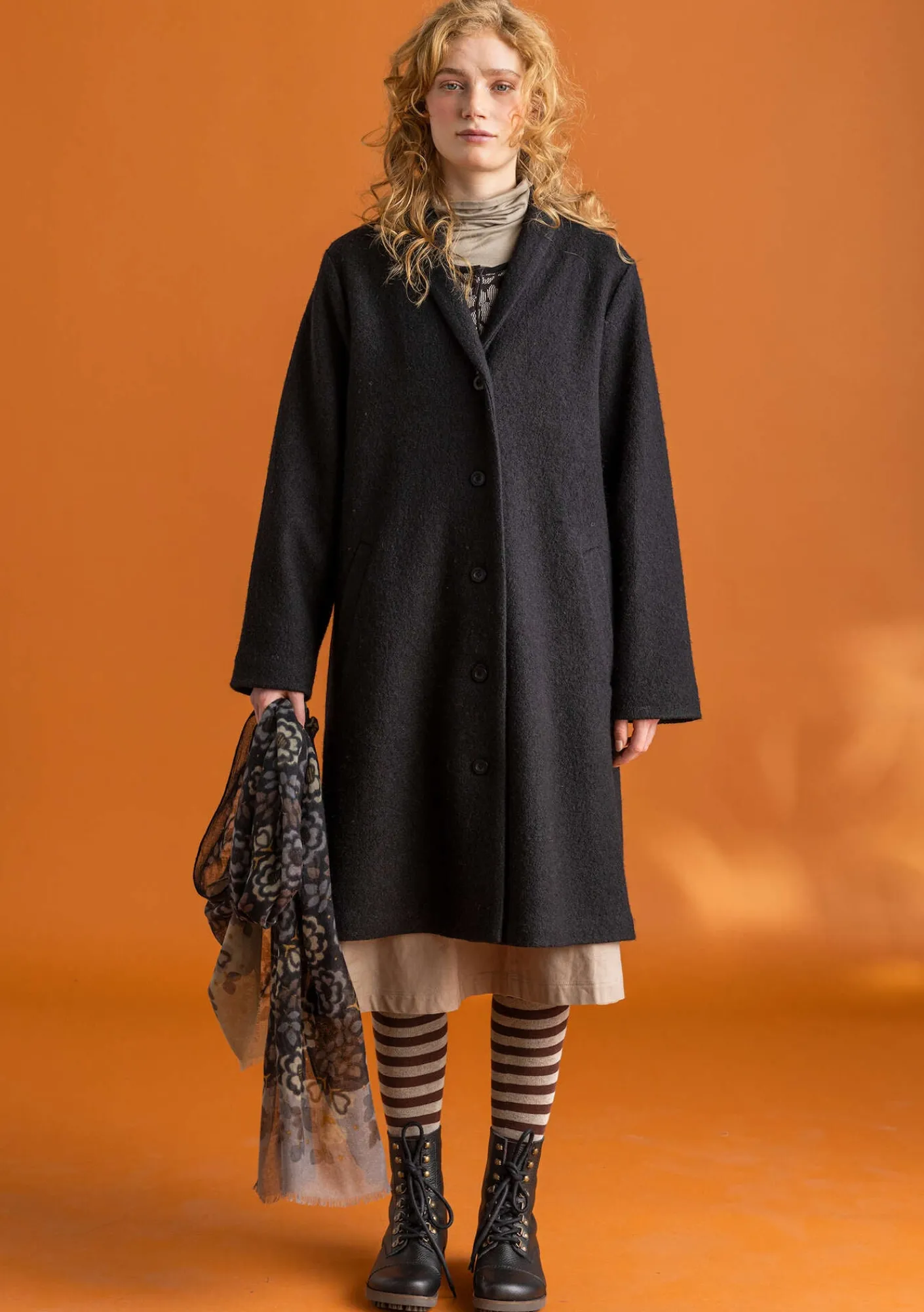 Mantel mit Schalkragen, Teilfutter und hübsch unregelmäßiger Struktur dank Bouclégarn. Einfarbiges Modell mit praktischen Taschen.