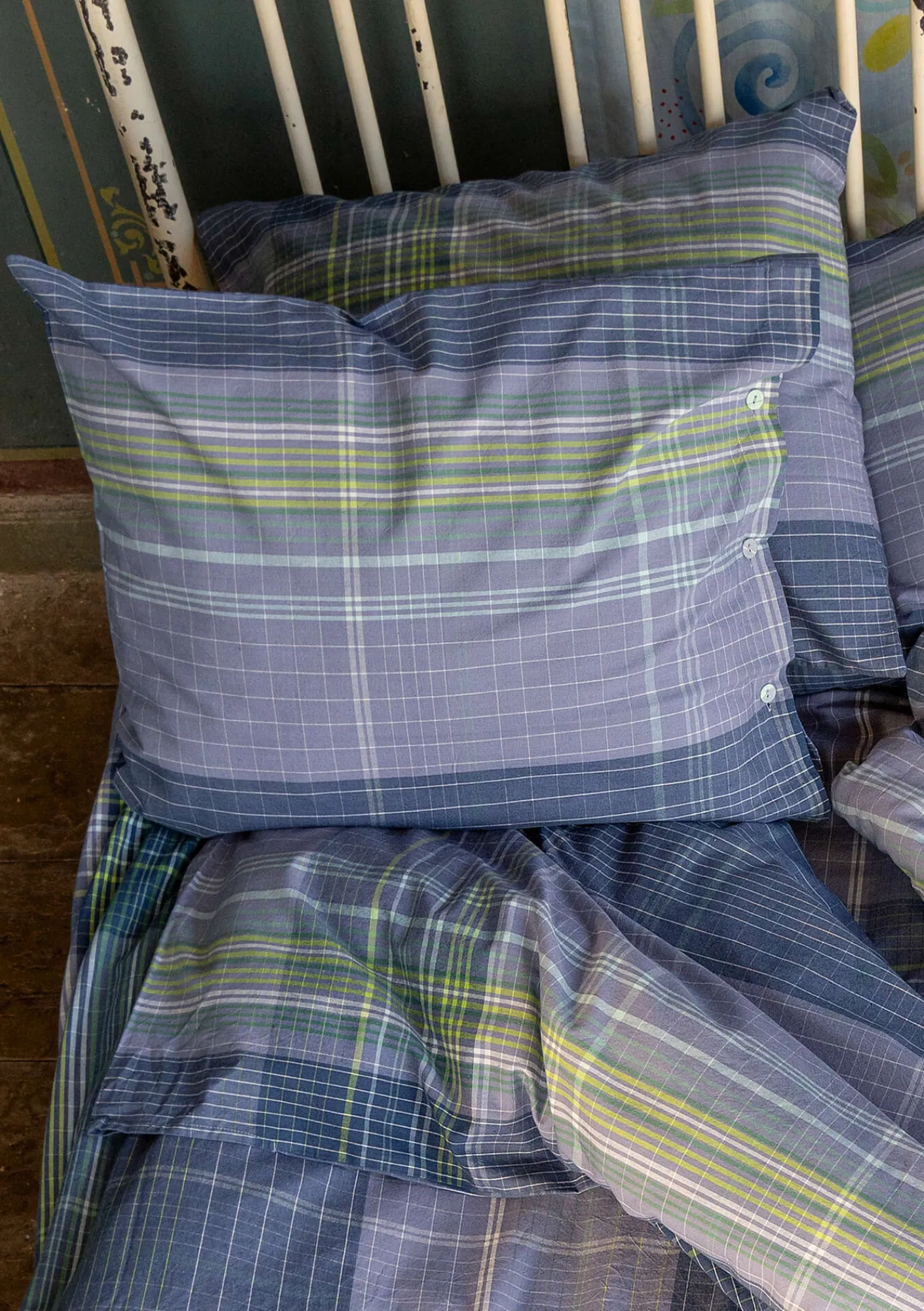 Kopfkissenbezug aus weicher, behaglicher Bio-Baumwolle. Schönes Webkaro mit herrlichem Farbenspiel. Mit seitlichen Stoffknöpfen zu schließen.