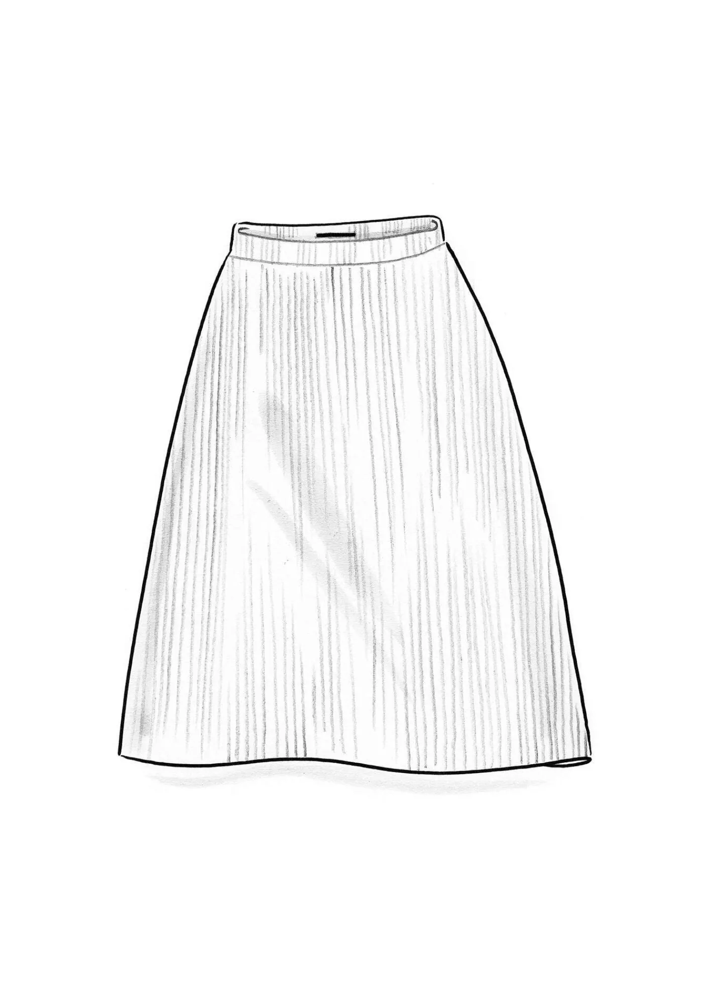 Patentstrickrock mit etwas längerer, ausgestellter Schnittführung. Rippbund mit innen liegendem Gummizug.