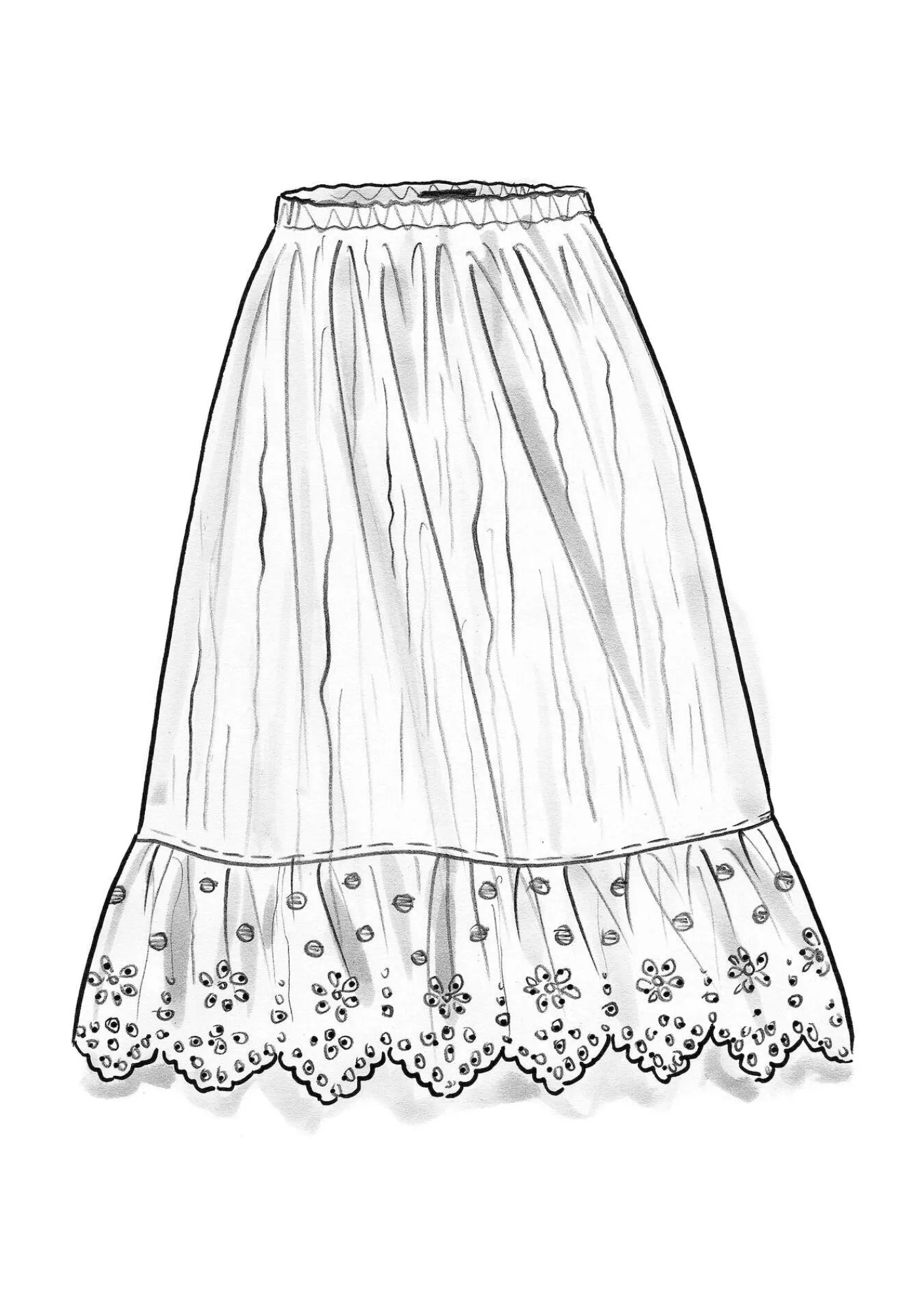 Schlichtes Modell mit Dehnbund. Bordüre mit Lochstickereien und Stickpunkten am Saum. Bund per Knopf verstellbar, für eine optimale Passform.