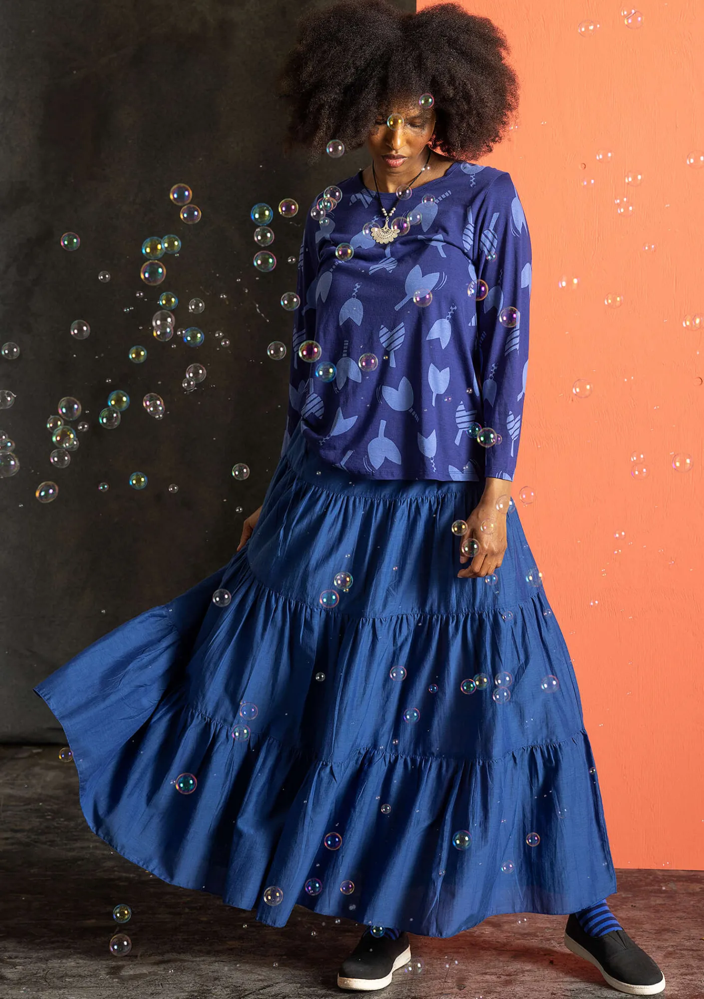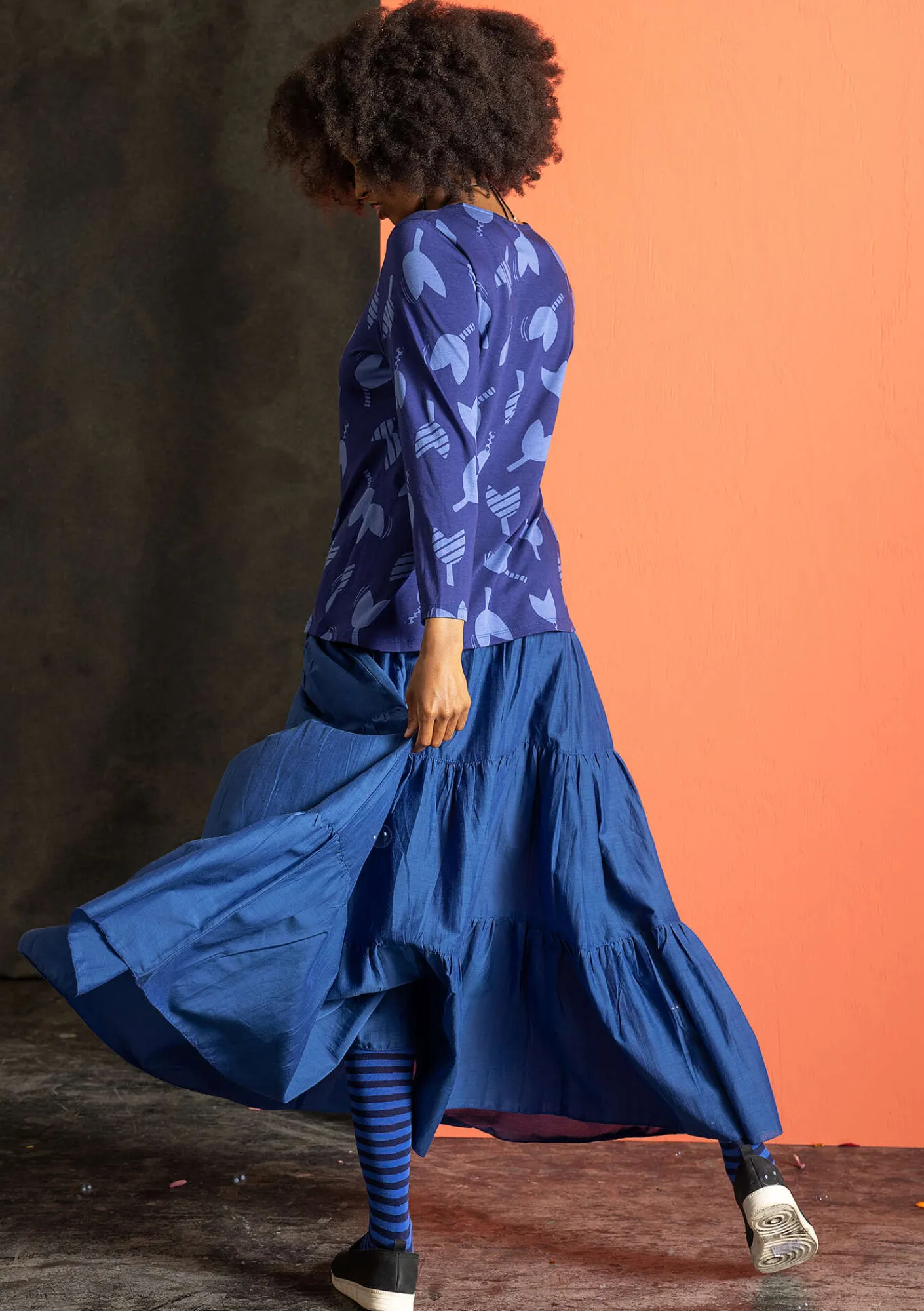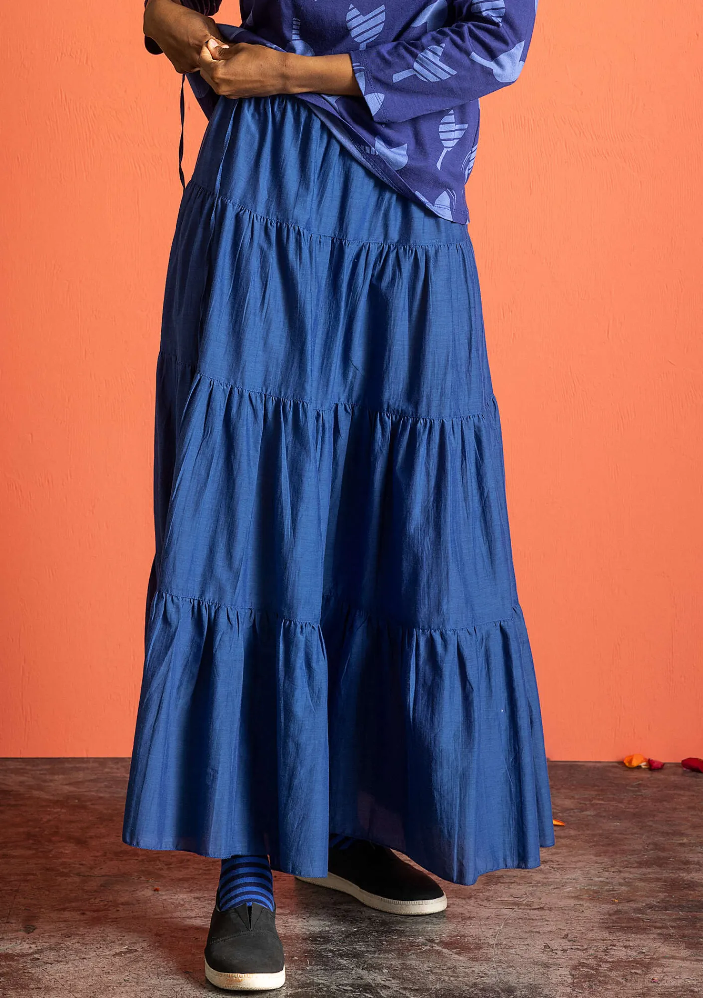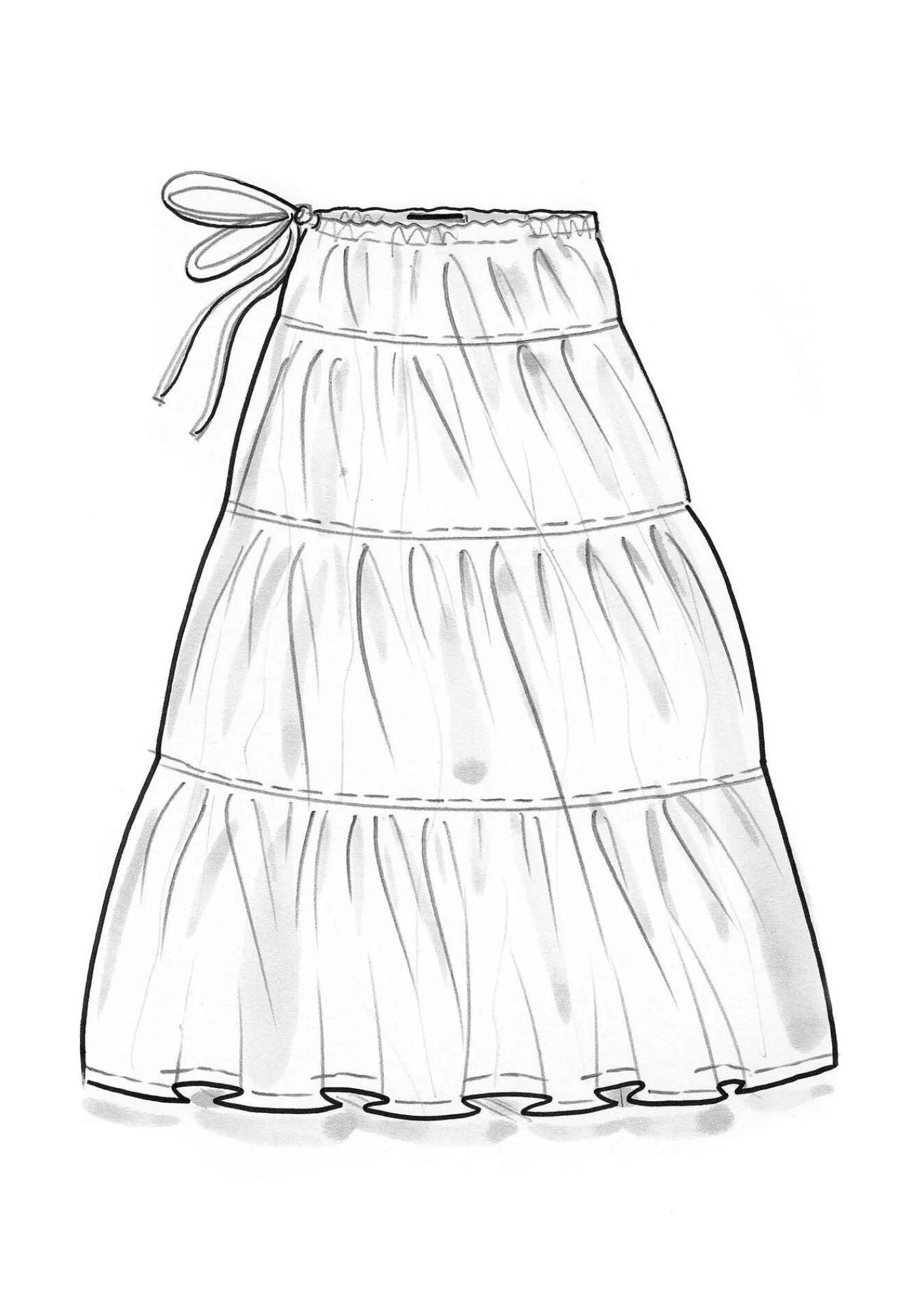 Weiter Rock aus einem herrlichen Baumwolle/Seide-Gewebe mit schönem Fall. Hübsches Modell mit vier Stufen und Tunnelzug im bequemen Dehnbund.