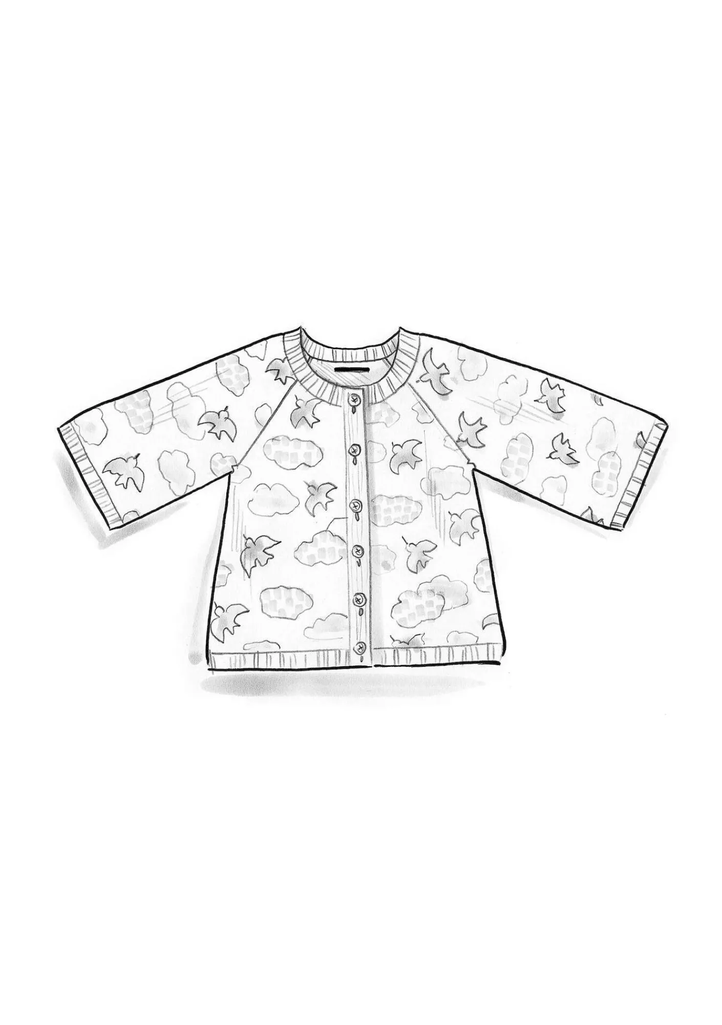 Etwas kürzere Strickjacke mit kerniger, kräftiger Haptik. Modell mit 3/4-Raglanärmeln und Rippbündchen. Jacquardstrick mit einem von Zugvögeln inspirierten Muster. Knöpfe aus Metall.