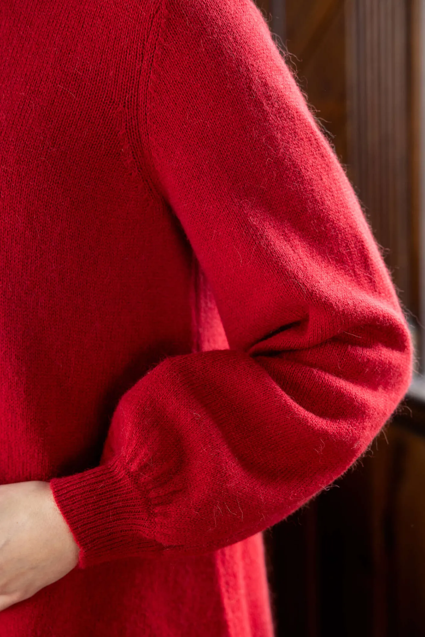 Glattstricktunika aus weichem Alpakawollgemisch, mit Seitenschlitzen. Pludrige lange Ärmel und Rundhalsausschnitt mit Rollkante. Rippbündchen an Ärmelabschlüssen und Saum.
