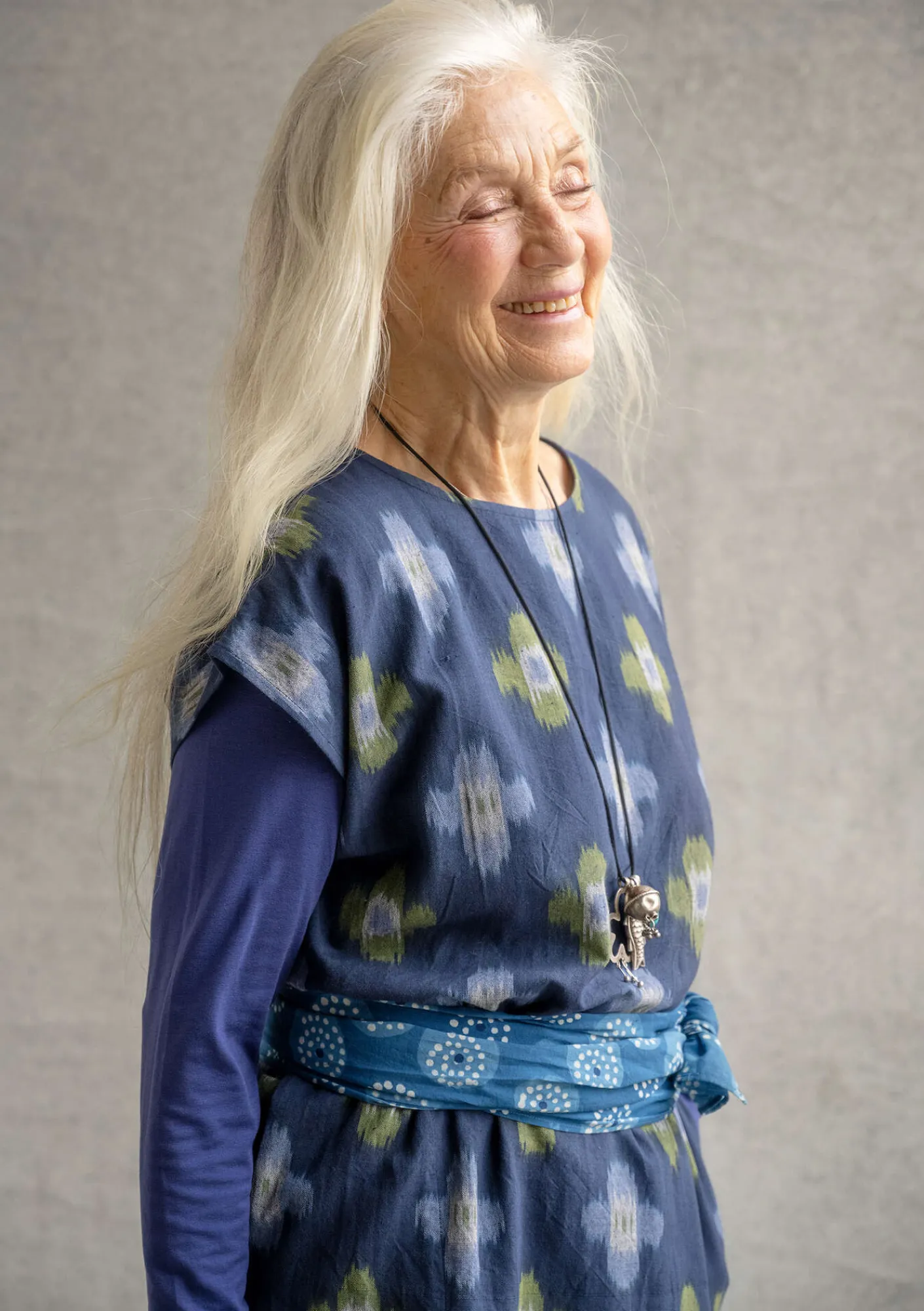 Gerade geschnittene Tunika aus Ikat-Gewebe, mit 1/8-Ärmeln und hohen Seitenschlitzen. Runder Ausschnitt und rechteckige Seitentaschen.