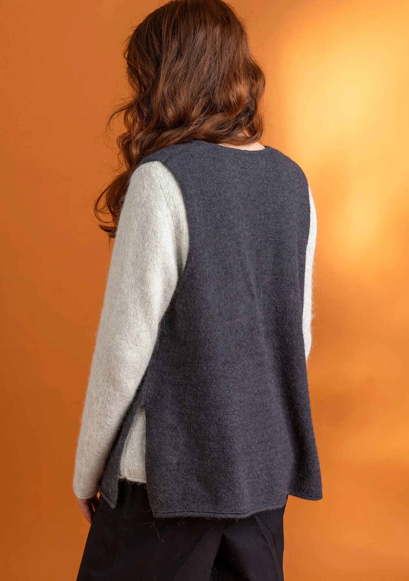 Etwas länger geschnittene Strickweste. Modell aus unserem weichen, flauschigen Melangegarn. Perlmuttknöpfe mit Häkelösen vorne und Schlitze an den Seiten.