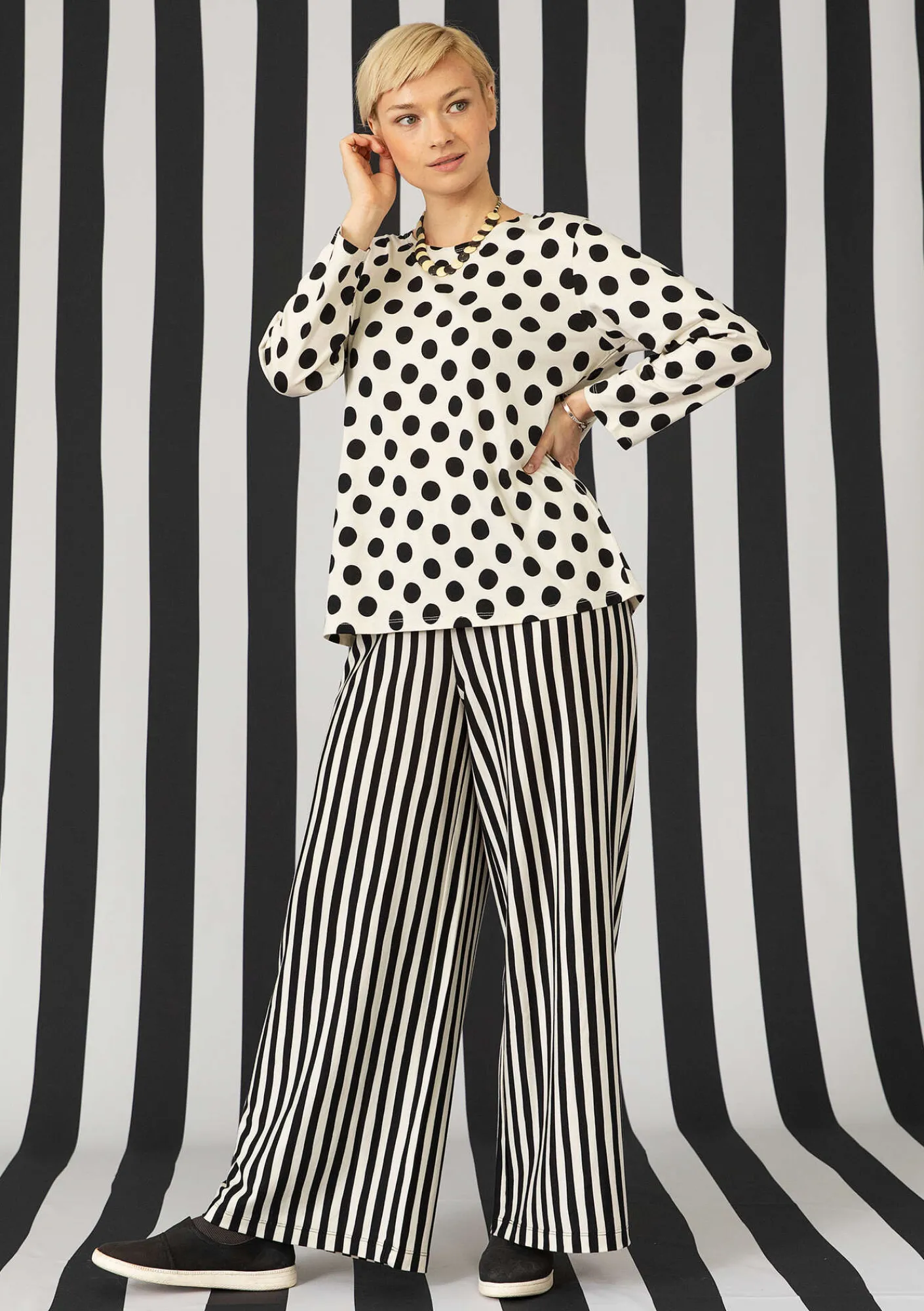 Lange Jerseyhose mit schöner Beinweite und bequemem Dehnbund. Längsstreifen dank geänderter Stoffrichtung.