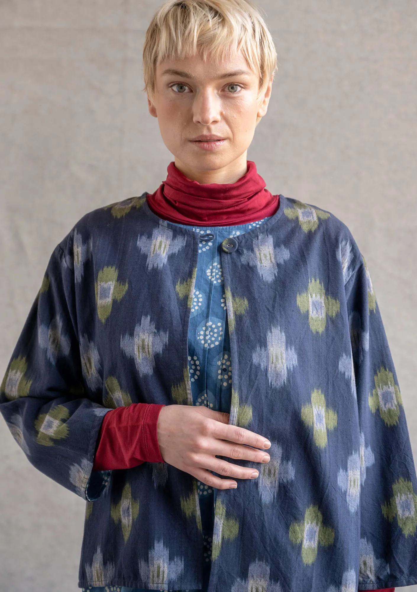 Jacke mit floralem Ikat-Webmuster. Leicht ausgestelltes Modell mit rundem Ausschnitt und 3/4-Ärmeln. Mit einem Stoffknopf zu schließen.