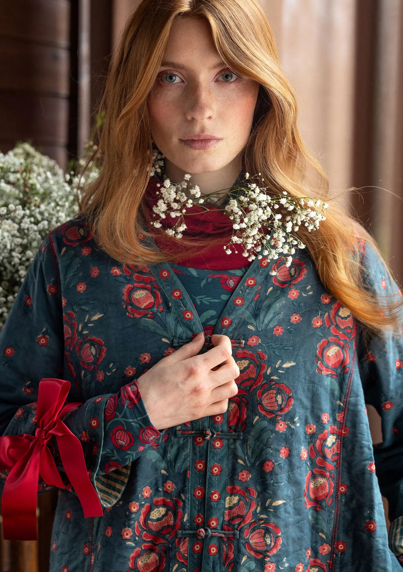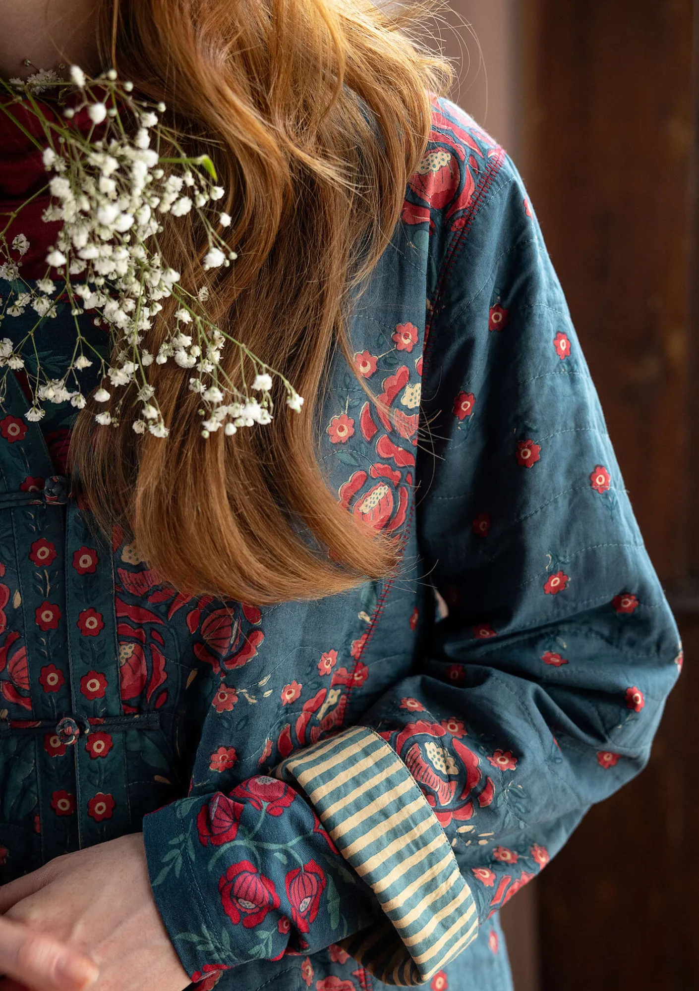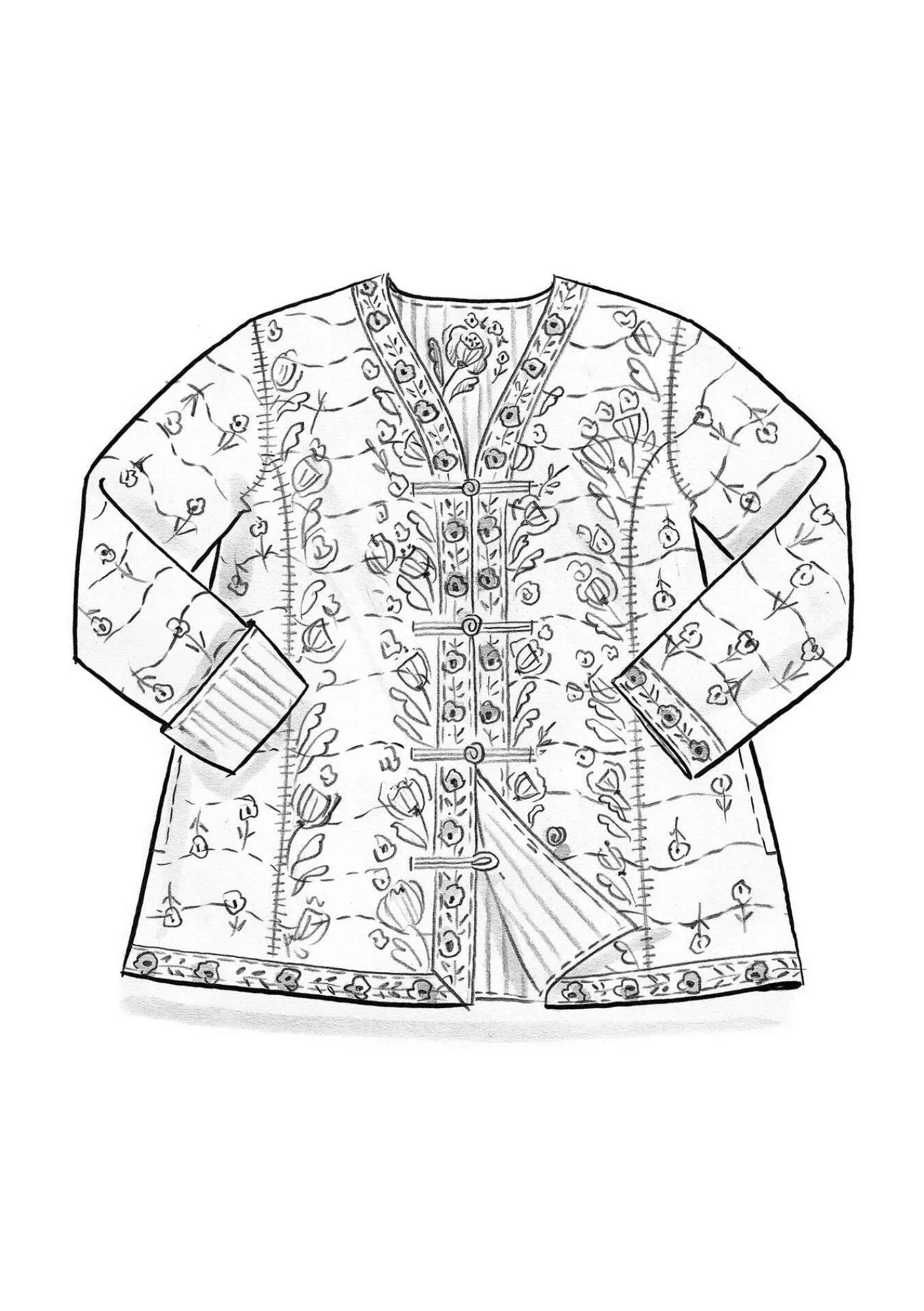 Gerade geschnittene Wendejacke mit Blockdruck und langen Ärmeln. Gestepptes Modell mit einer leichten Schicht aus Baumwollflanell. Seitentaschen und eine aufgesetzte Tasche. Aufwendig mit einer Stickblüte auf dem Rücken gearbeitet. Ganz klassisch mit Stoffknöpfen im China-Stil zu schließen.