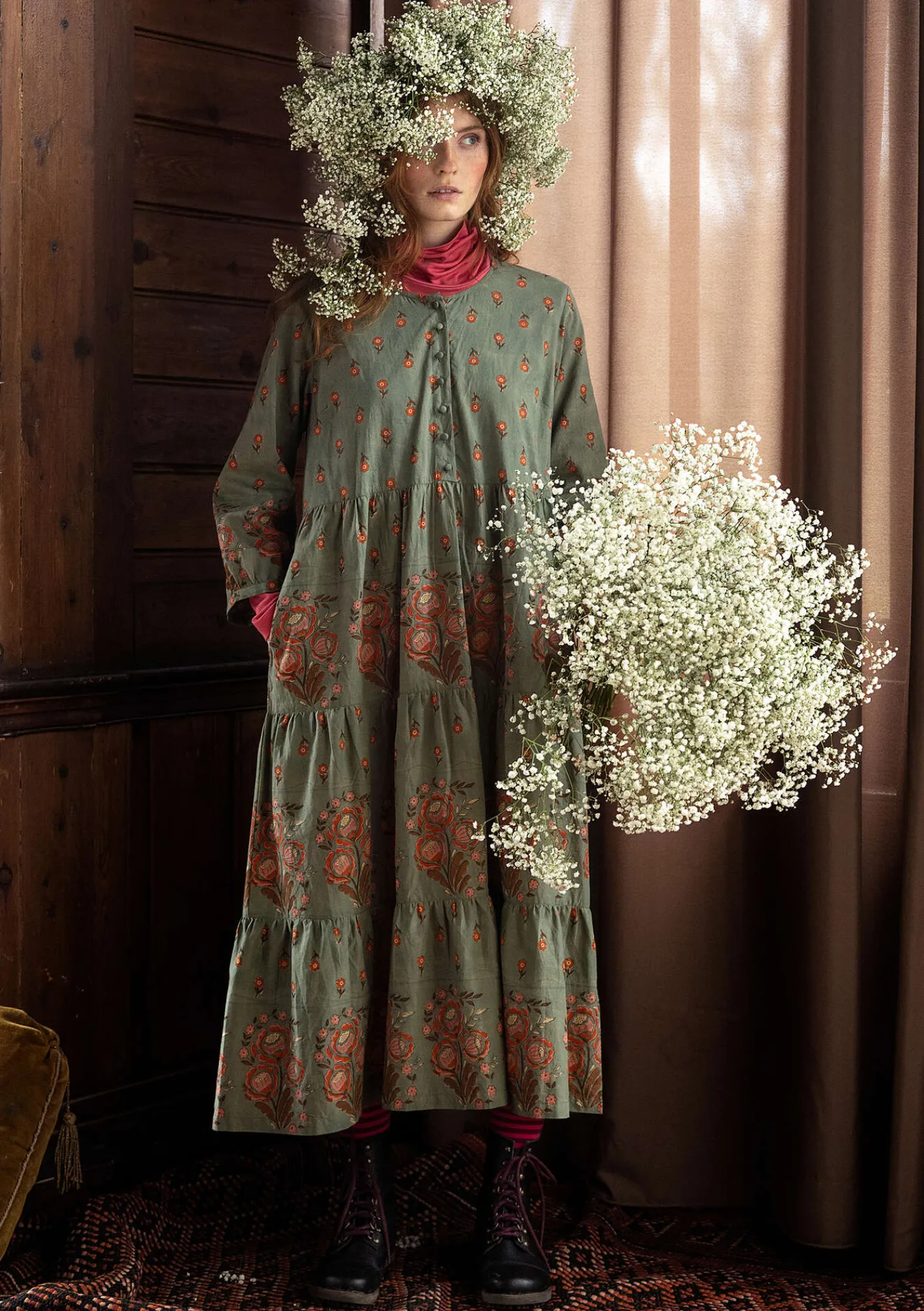 Langes Blockdruck-Kleid mit schönen Bordüren. Modell mit gekräuselten Stufen. Teilungsnaht in der Taille und Stoffknöpfe oben. 3/4-Ärmel und runder Ausschnitt.