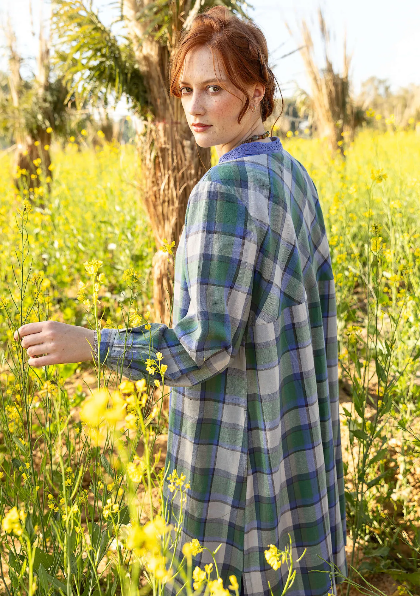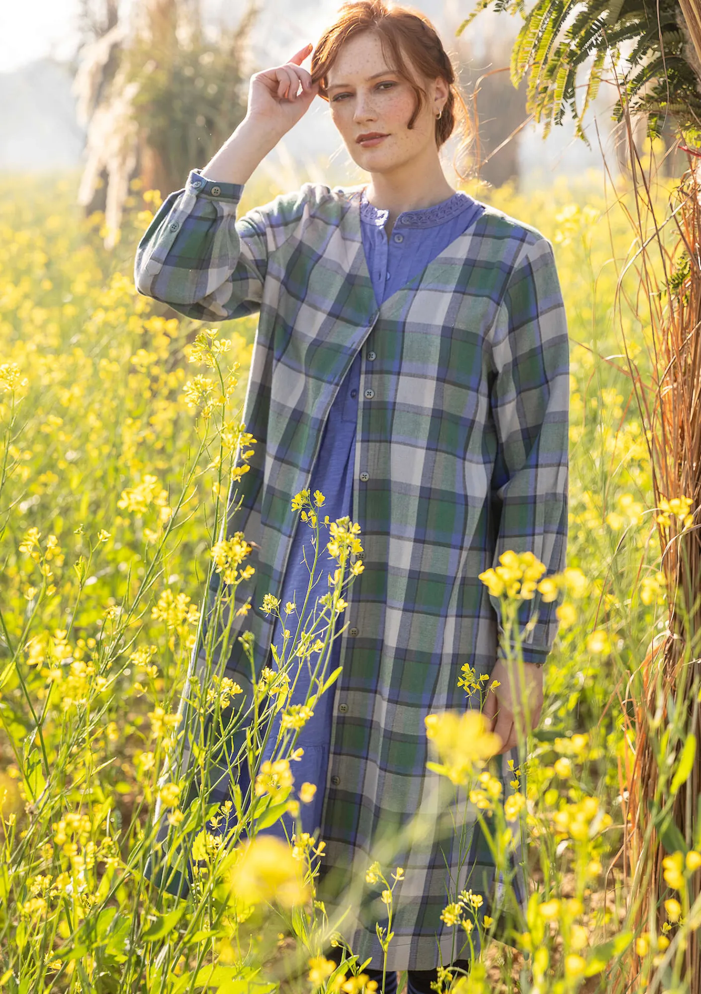 Legeres, bequemes Flanellkleid mit Webkaro und V-Ausschnitt. Durchgehende Knopfleiste mit Metallknöpfen, die oben sichtbar und nach unten hin verdeckt sind. Leicht pludrige lange Ärmel. Seitenschlitze und Seitentaschen.