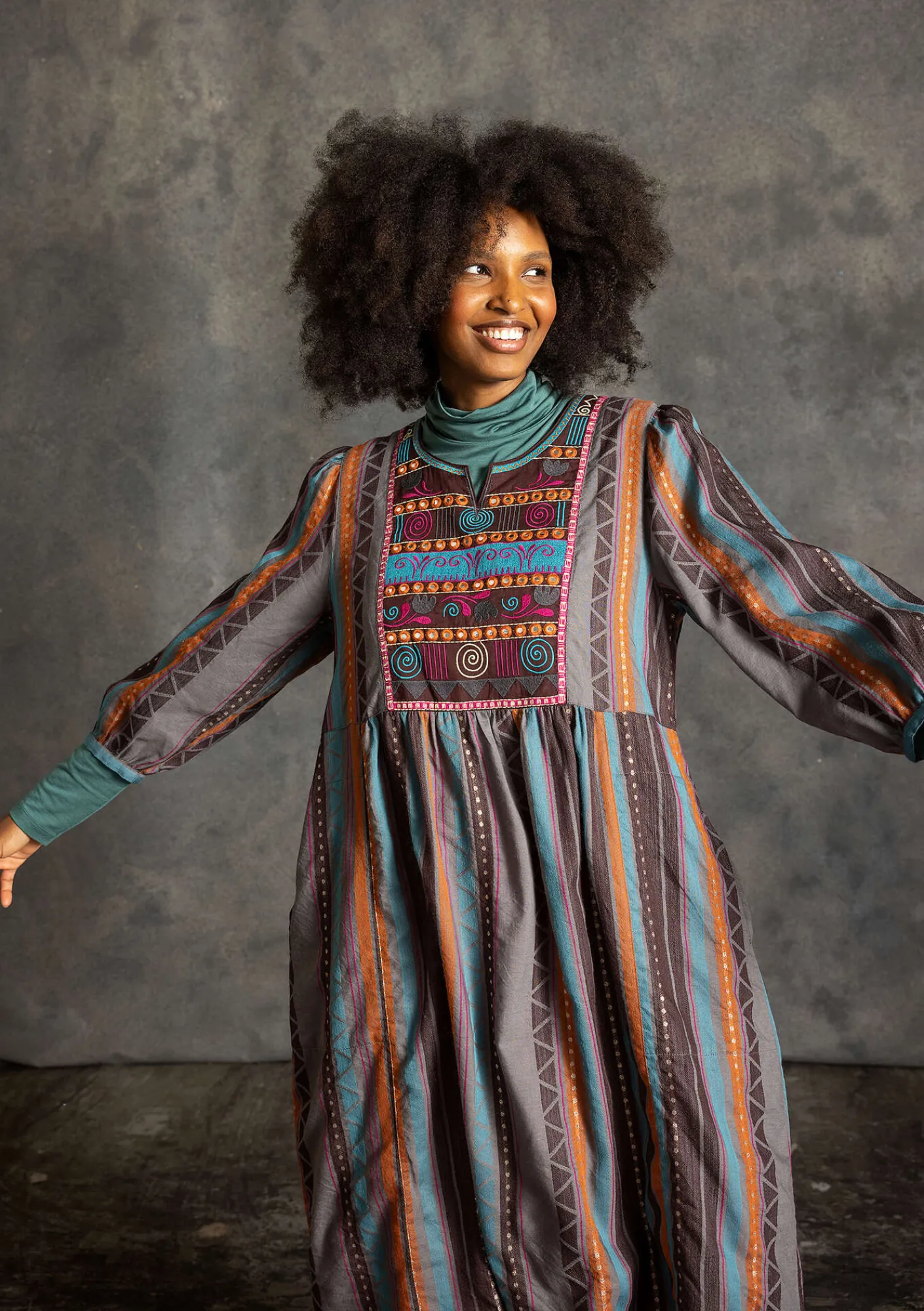 Webkleid mit üppig bestickter Passe vorne. Runder Ausschnitt mit kleinem Schlitz. An der Schulter und an den Abschlüssen angekräuselte 3/4-Ärmel. Teilungsnaht mit Kräuselung in der Taille. Futter mit Punktedruck im Nacken und am Saum.