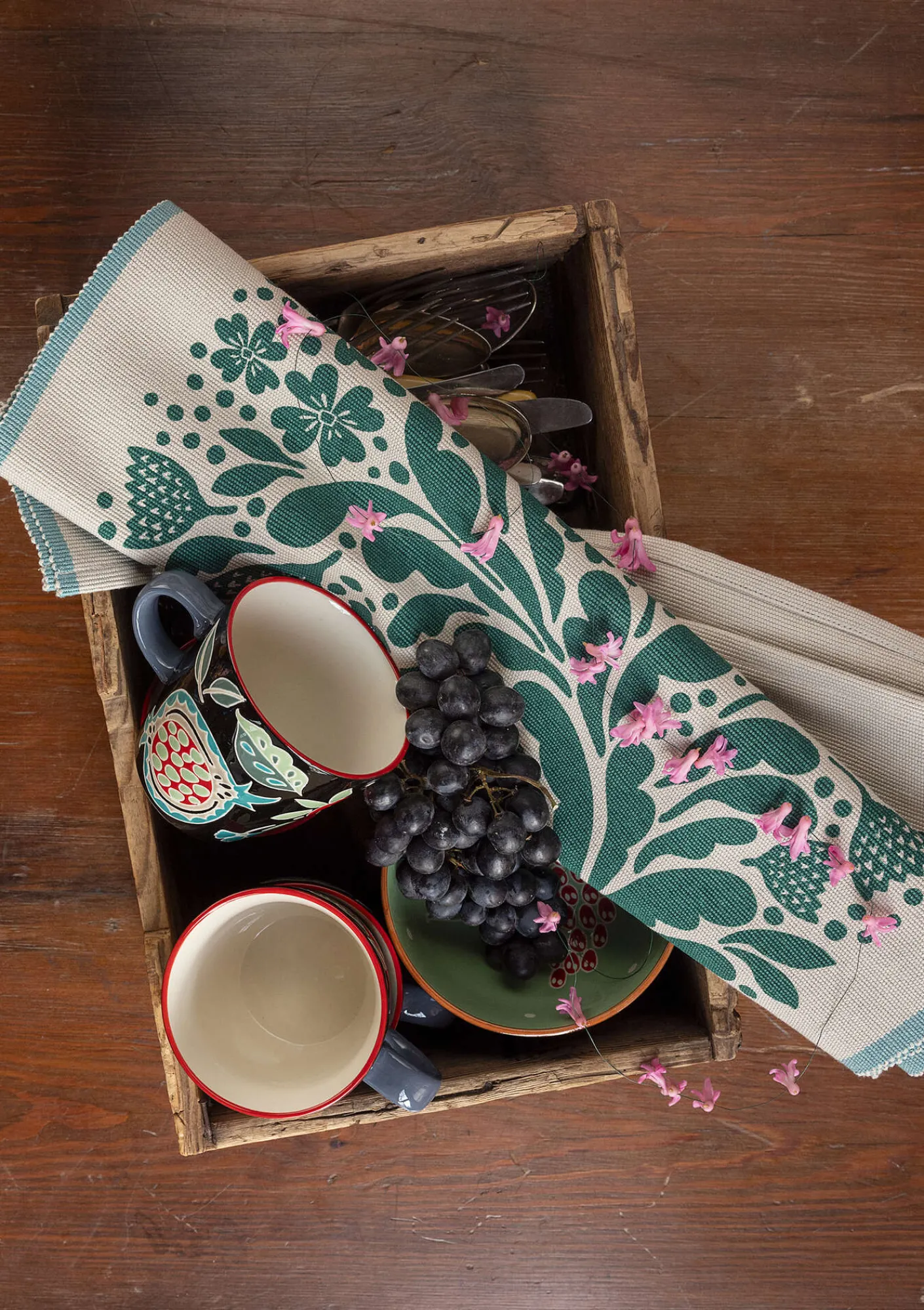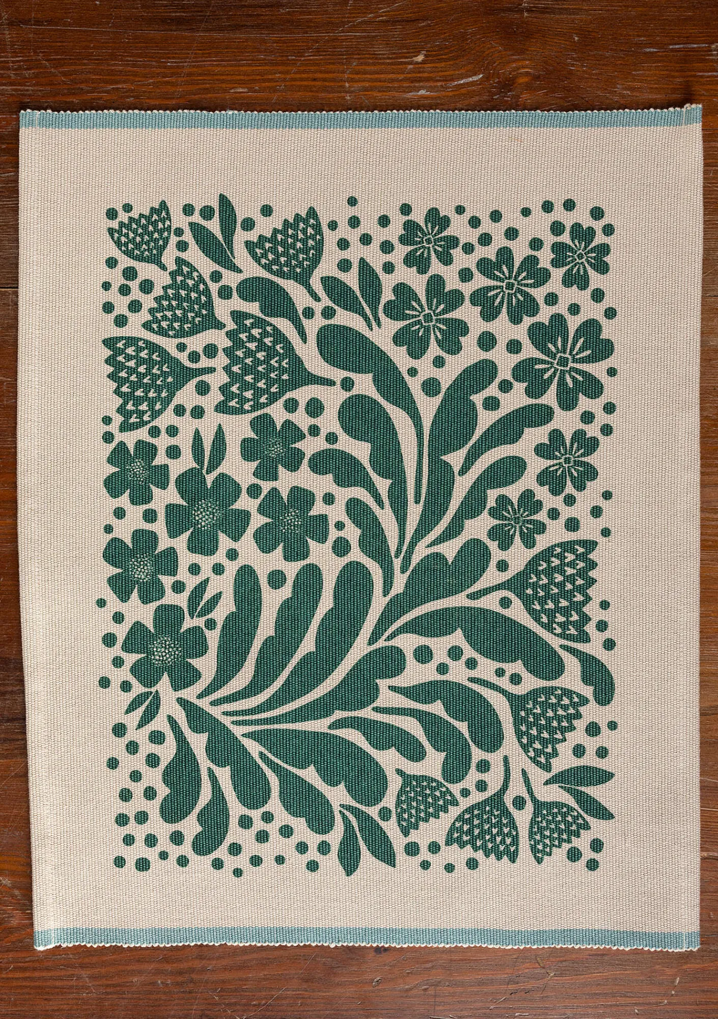 Tischset aus dichtem Rips, bedruckt mit einem herrlichen Blumenfeuerwerk. Farblich kontrastierende Webkanten als dekoratives Element.
