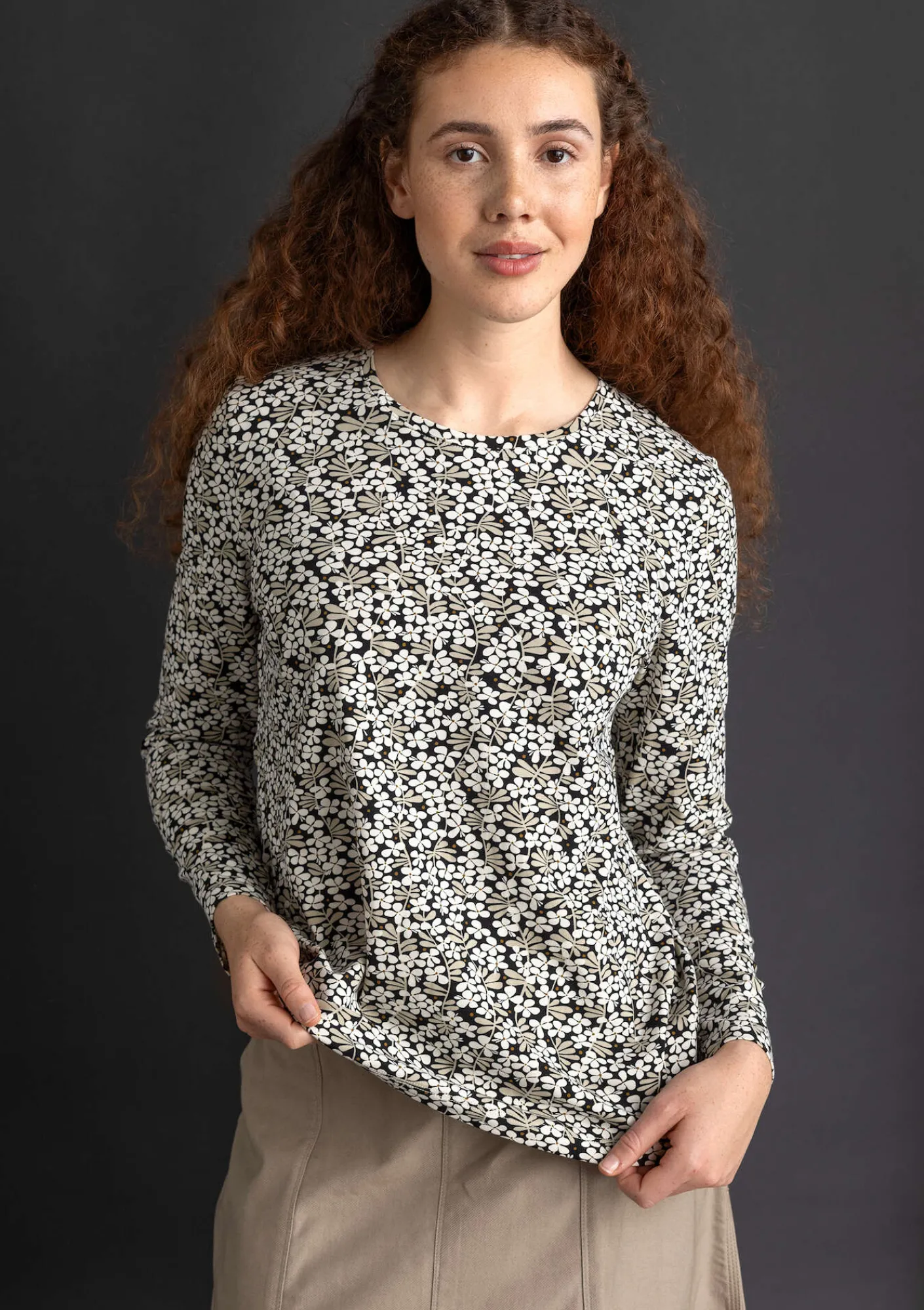 Vielseitiges Langarmmodell mit rundem Ausschnitt. Sowohl einfarbig als auch mit unserem kleinen Blumenprint „Ylva“ zu haben.