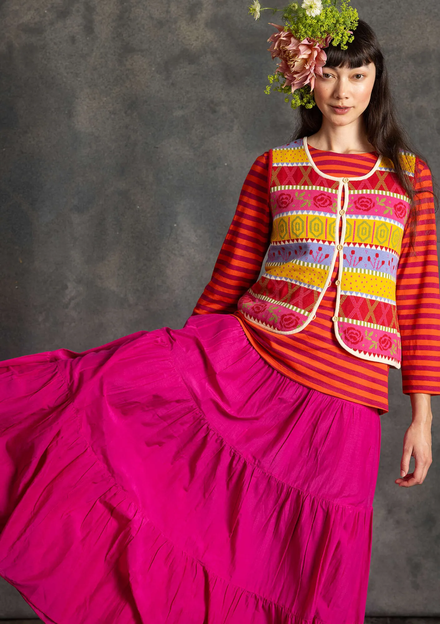 Weiter Rock aus einem herrlichen Baumwolle/Seide-Gewebe mit schönem Fall. Hübsches Modell mit vier Stufen und Tunnelzug im bequemen Dehnbund.