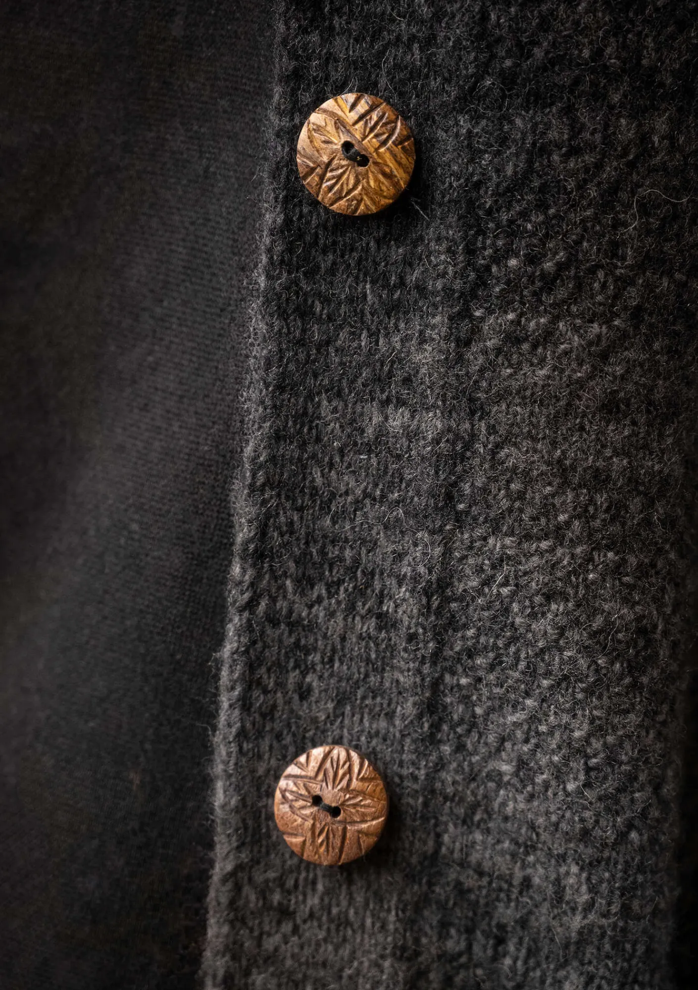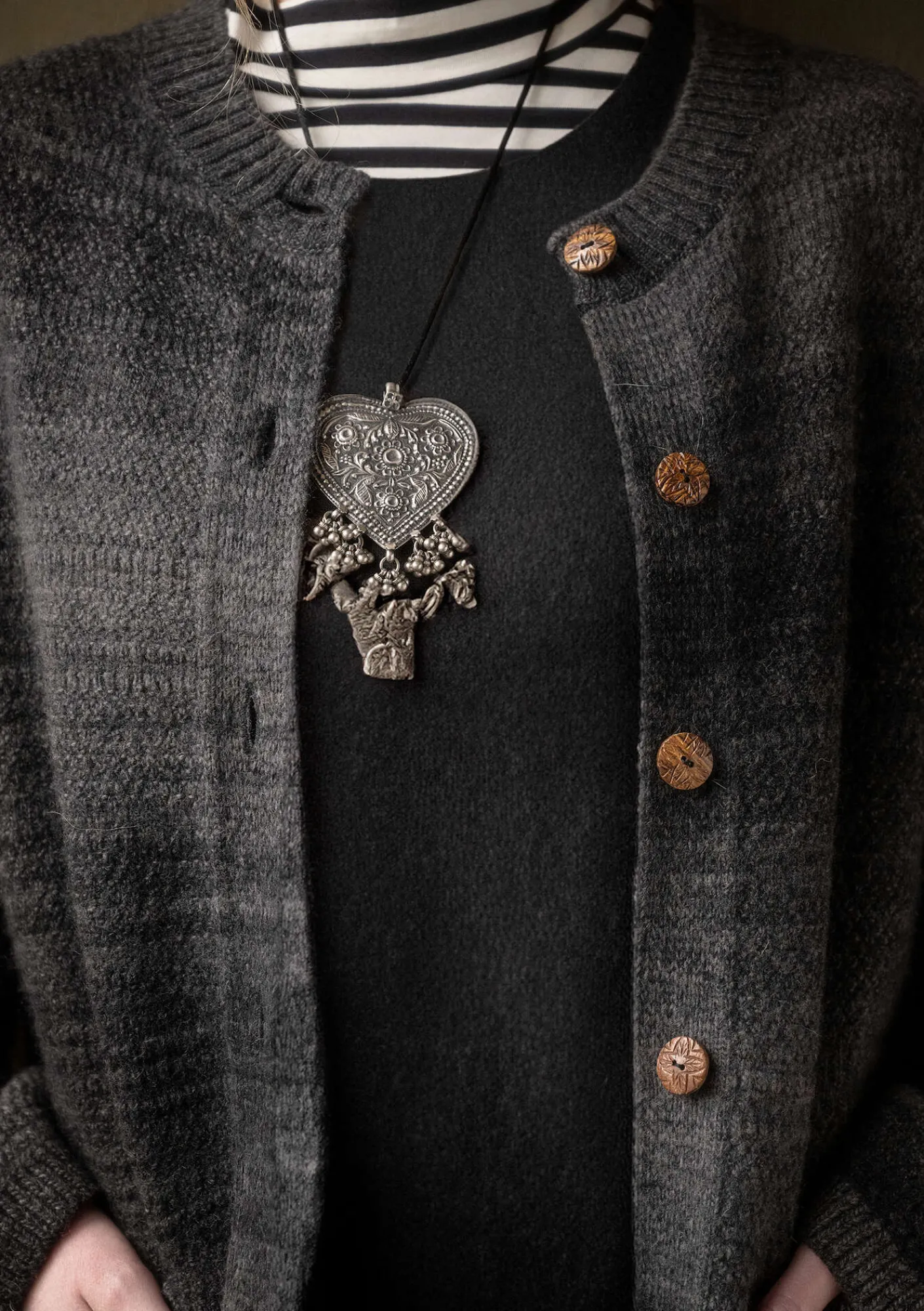 Strukturstrickjacke aus einem außergewöhnlichen, unregelmäßig gefärbten Effektgarn, das wir selbst designt haben. Dies macht jede Strickjacke zu einem Unikat, da die Streifen bei jedem Exemplar anders ausfallen. Langarmmodell mit rundem Ausschnitt, aufgesetzten Taschen und Rippbündchen. Mit Ornamentknöpfen aus Naturholz zu schließen.
