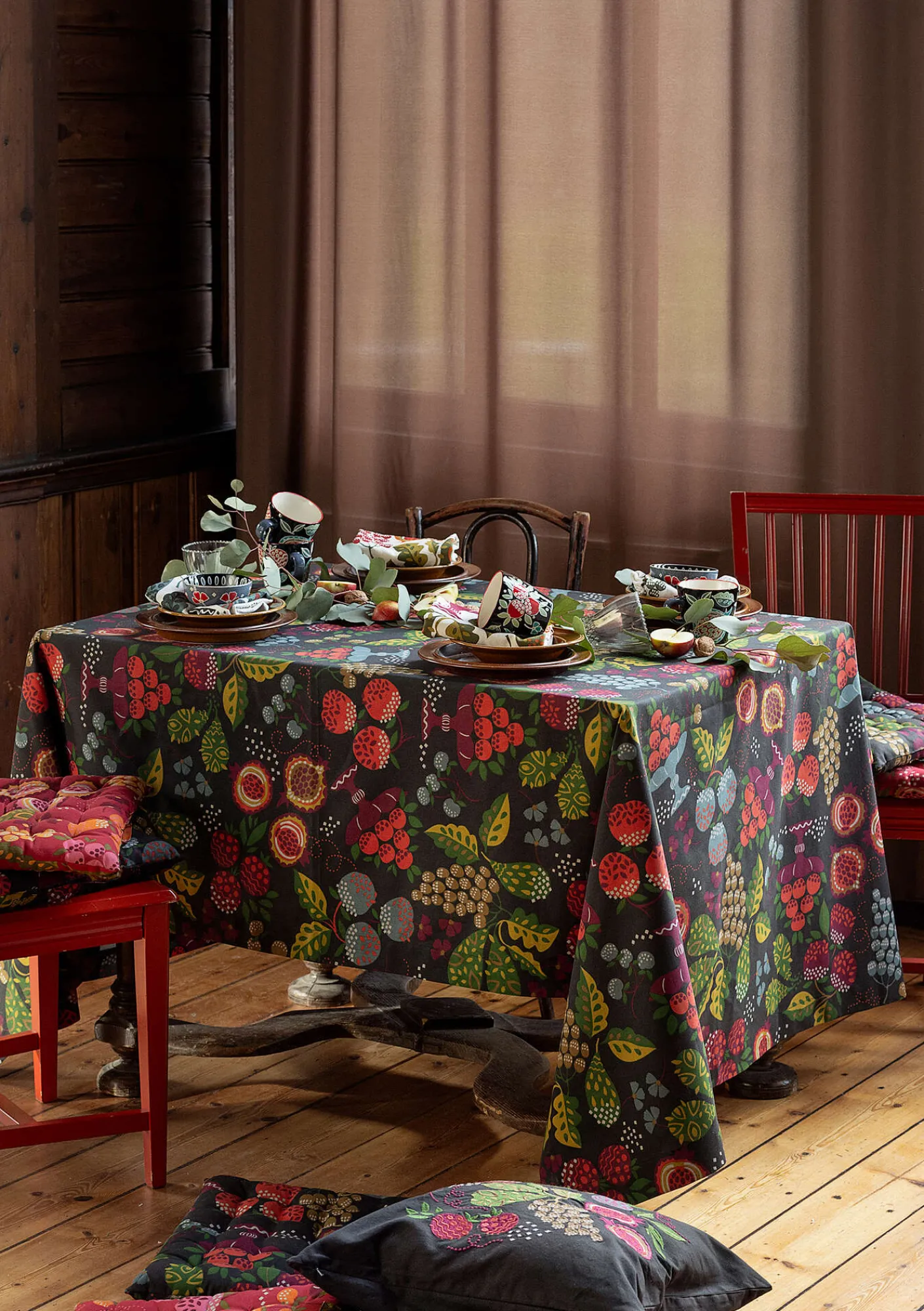 Farbstarke Tischdecke mit einem Muster von kandierten Früchten in herrlichen Nuancen. Rechteckiges Modell.