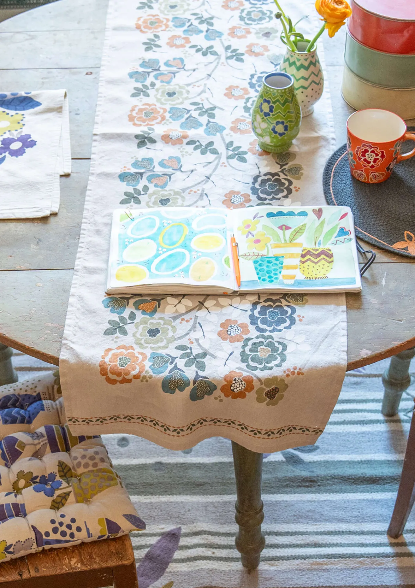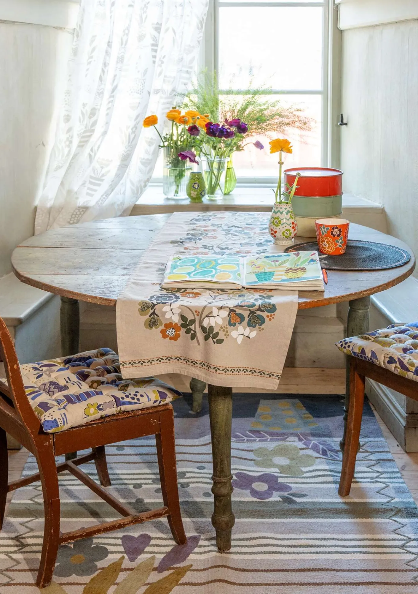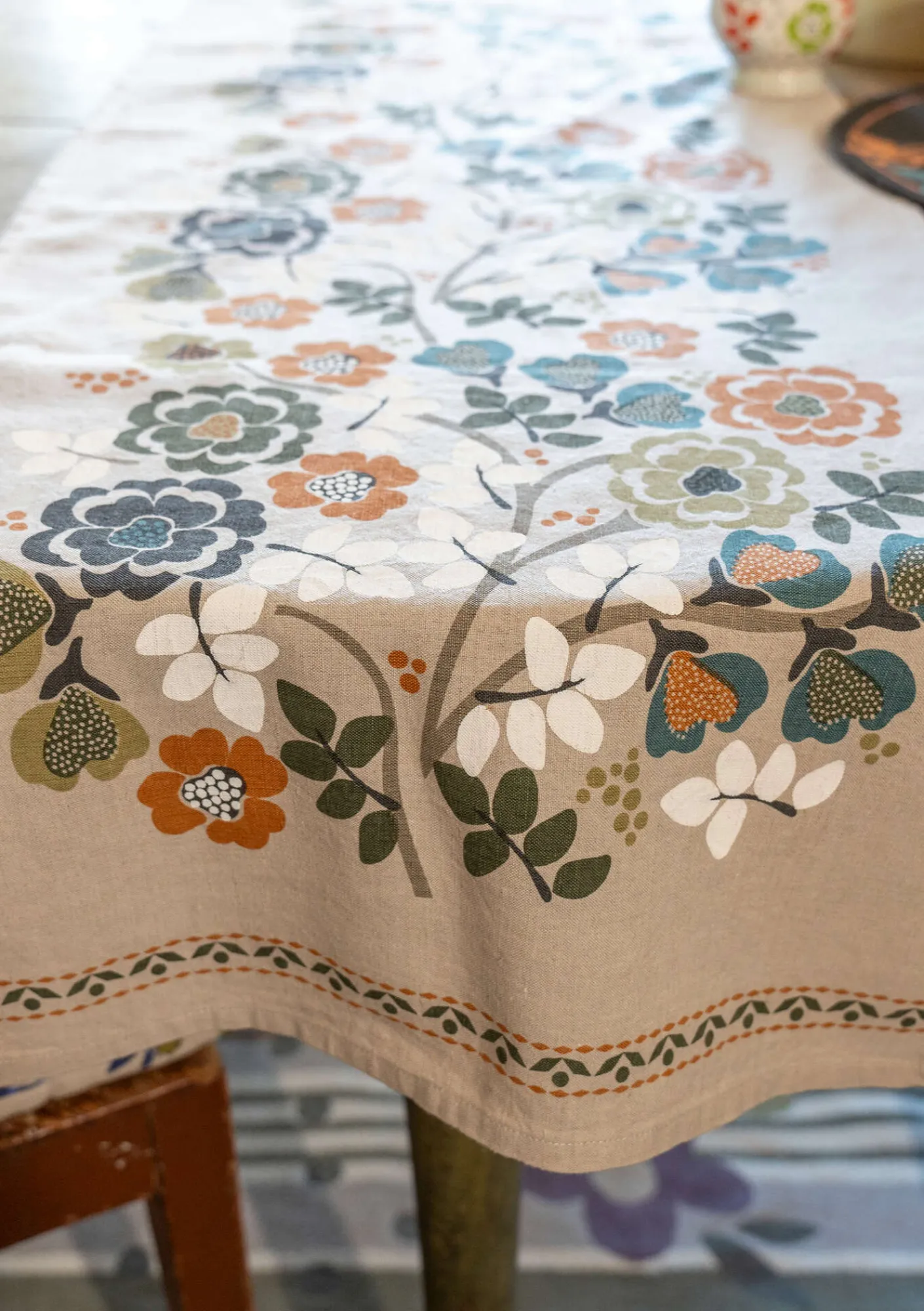 Schöner Tischläufer mit dem Dessin „Wild rose“ und dekorativen Bordüren an den Schmalseiten. Siebdruck auf einem Gewebe aus Leinen und Bio-Baumwolle.