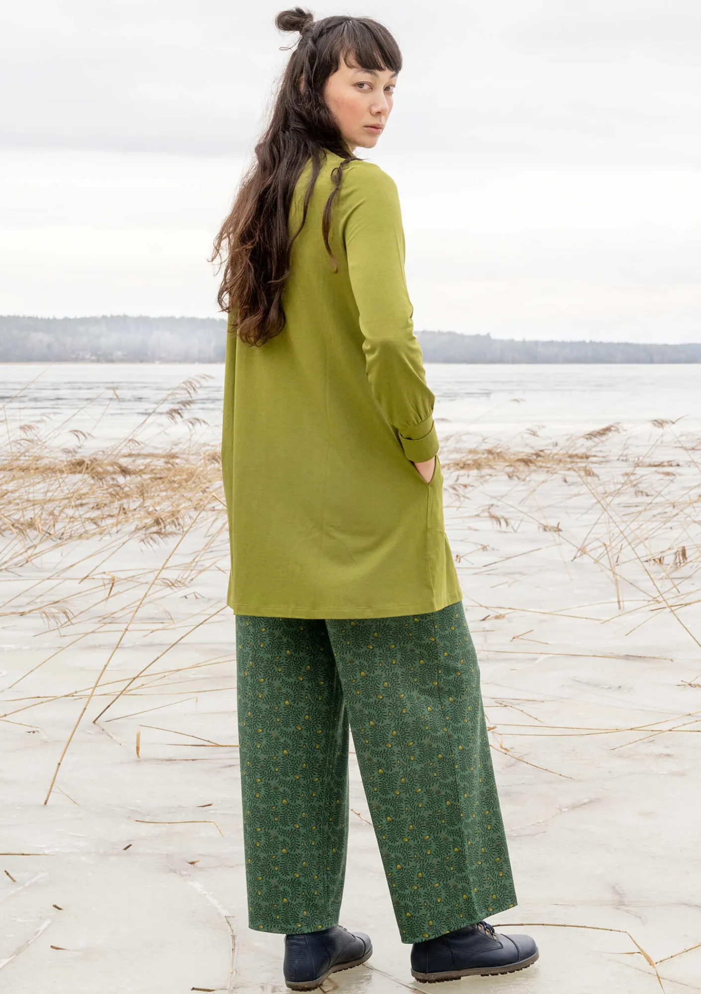 Einfarbige Jerseytunika in A-Linie, mit Rollkragen und Taschen in den Seitennähten. Umschlagbare Ärmelbündchen.