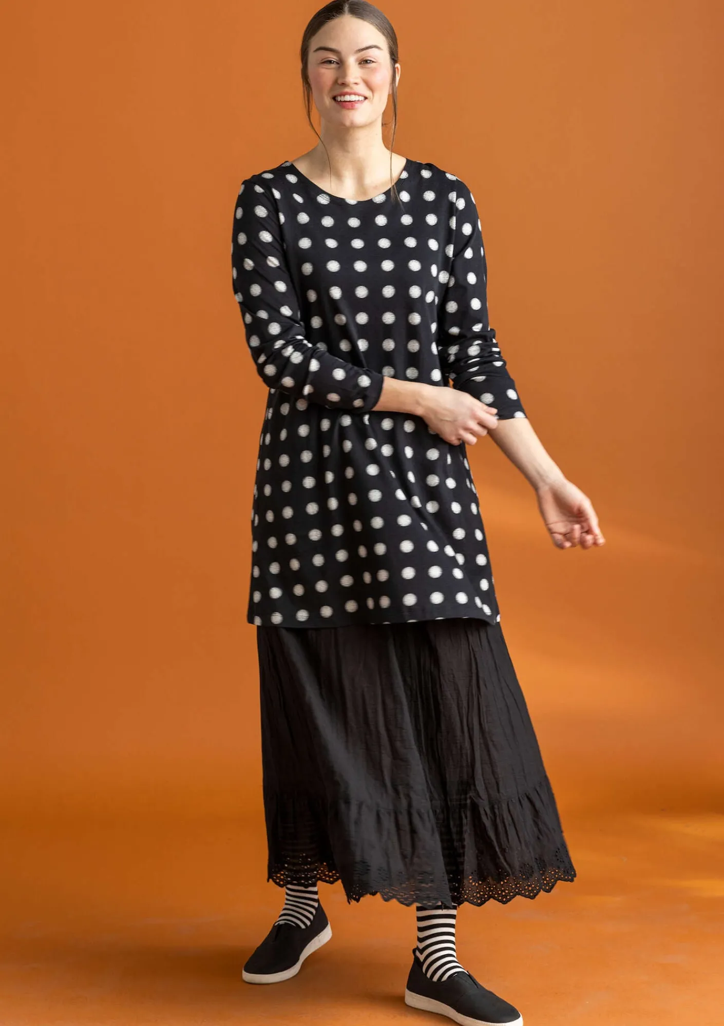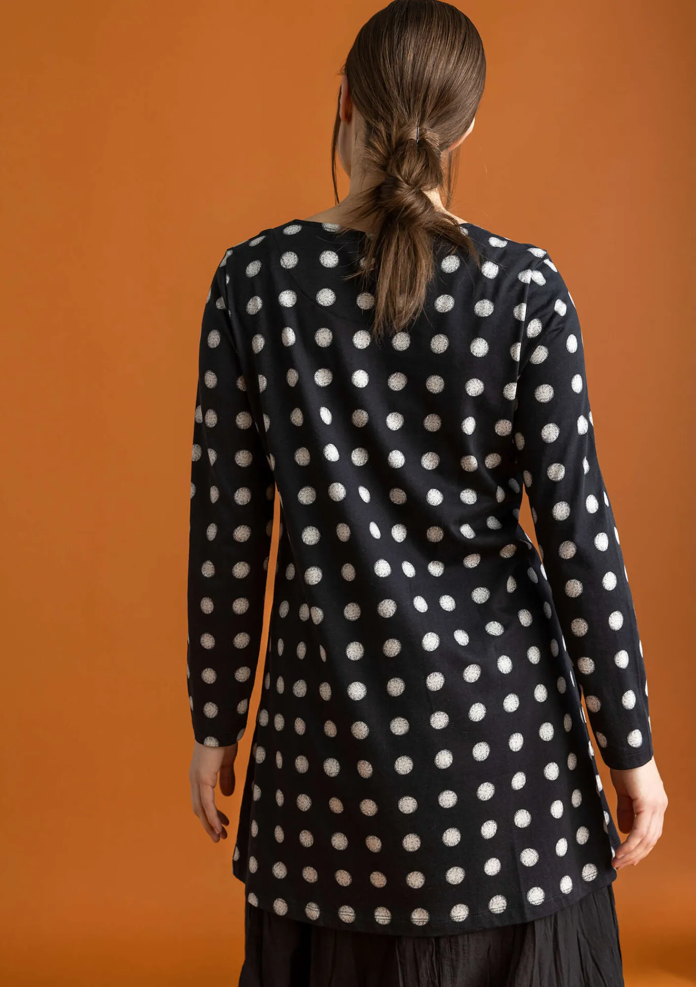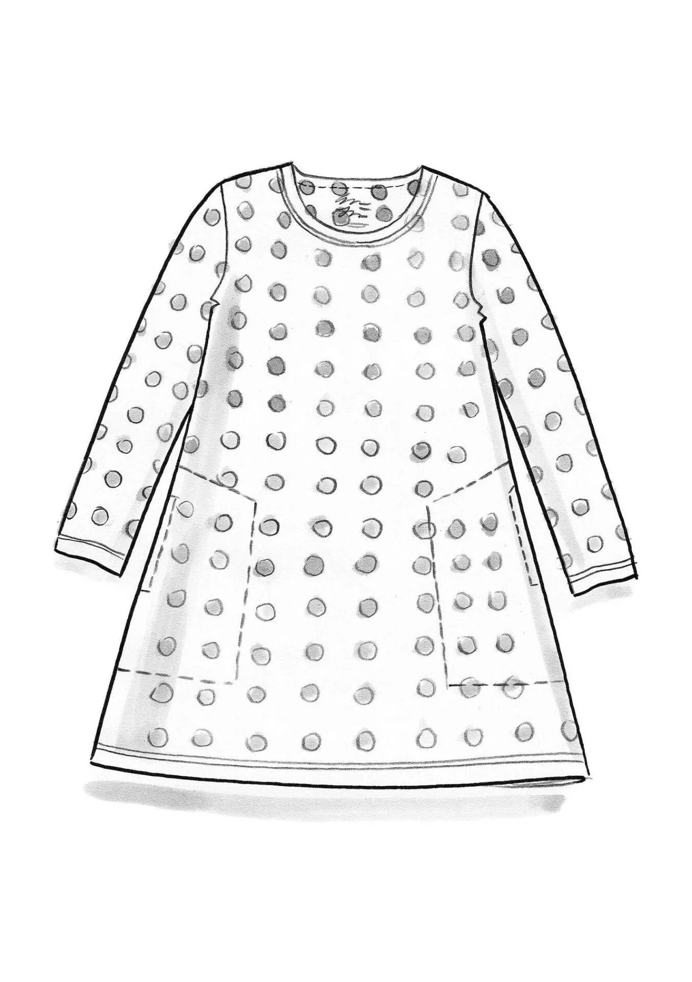 Schlichtes Modell mit rundem Ausschnitt und Seitentaschen. Lange Ärmel. Einfarbig und mit dem Punkteprint „Tyra“ zu haben. Leicht ausgestellter Schnitt.